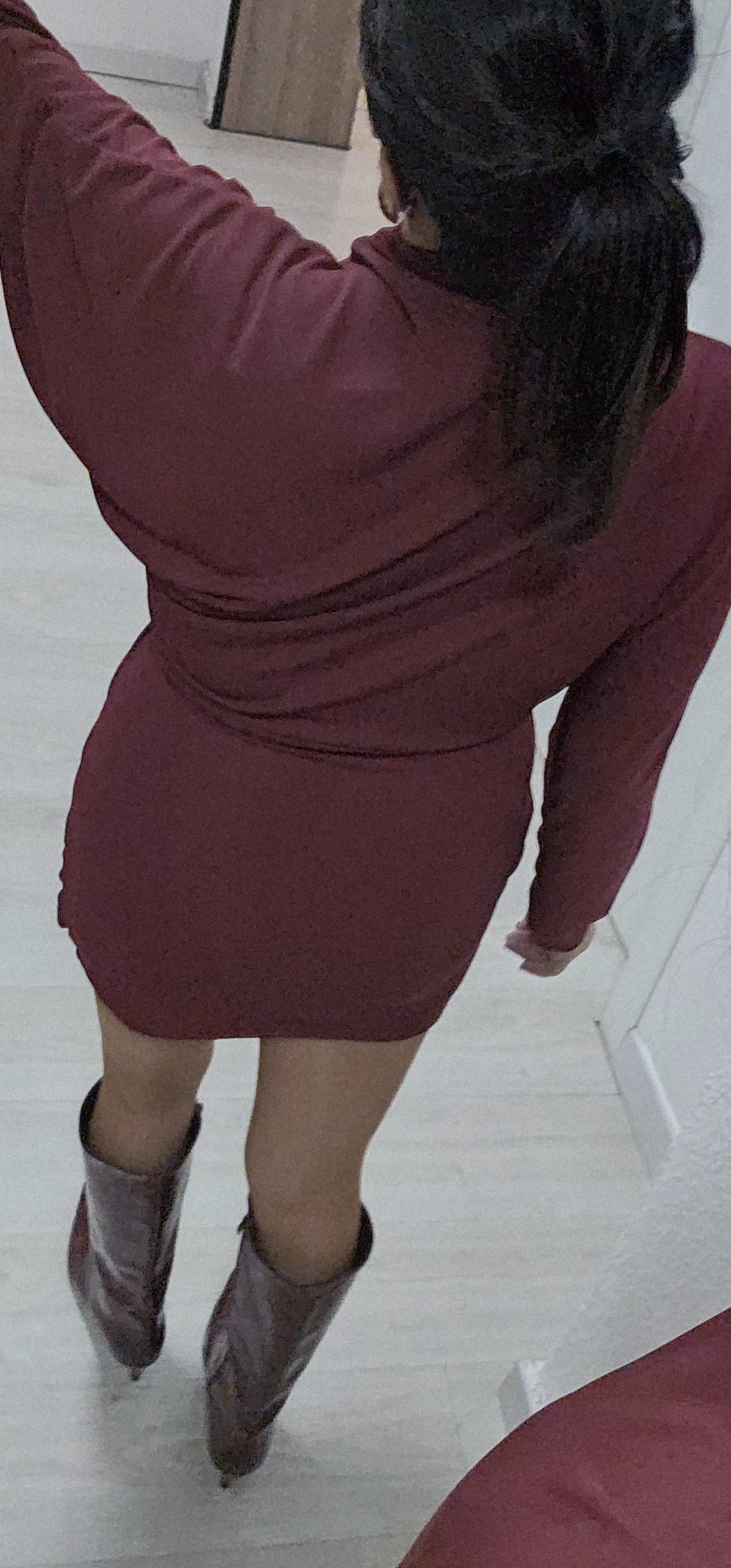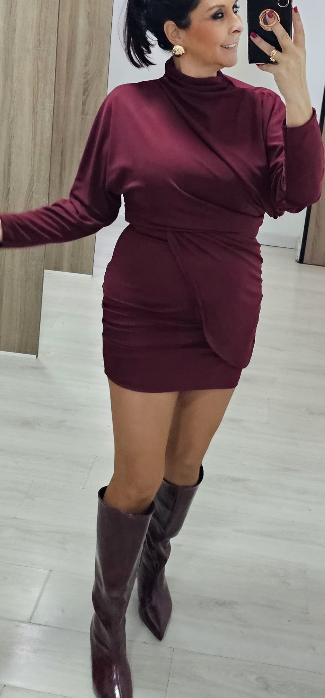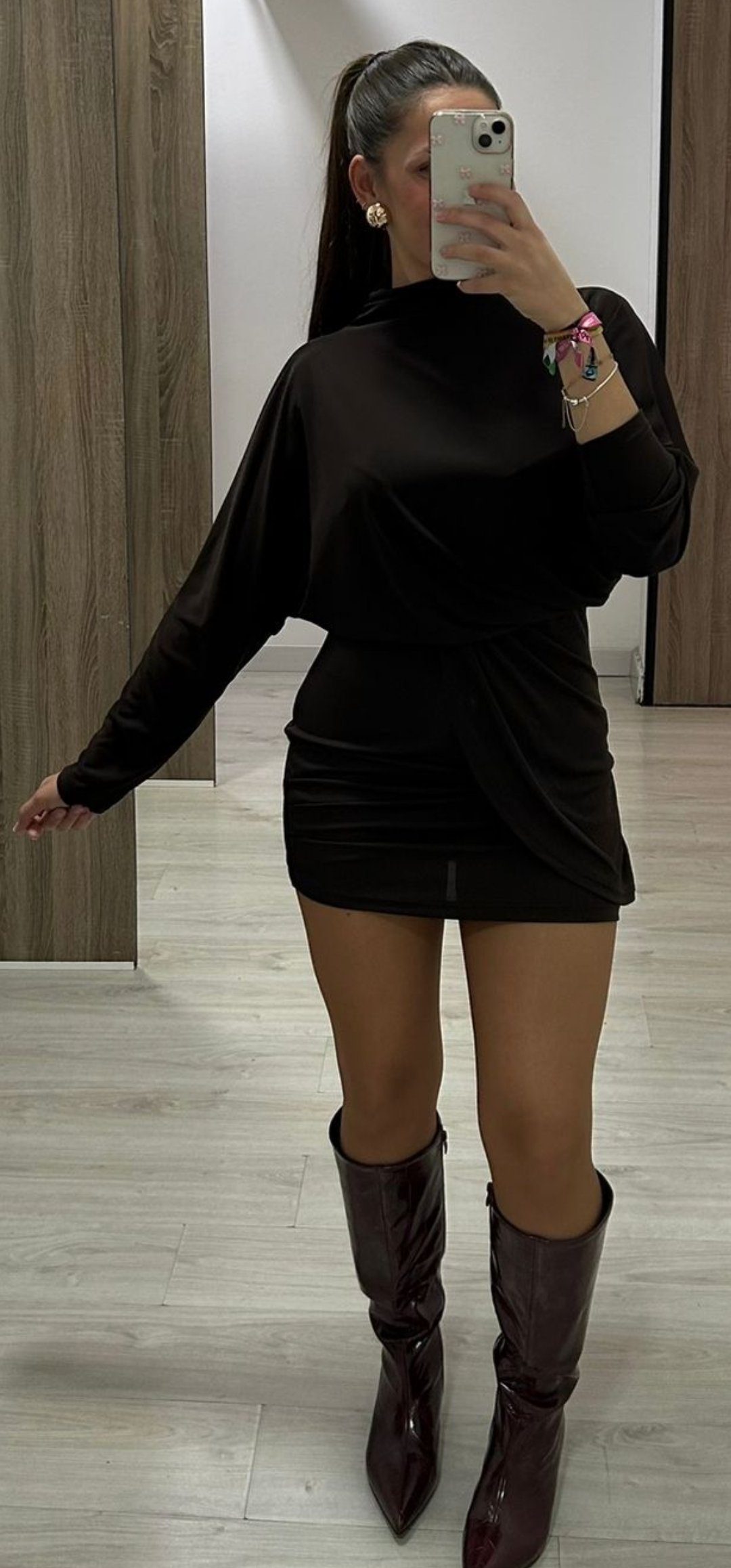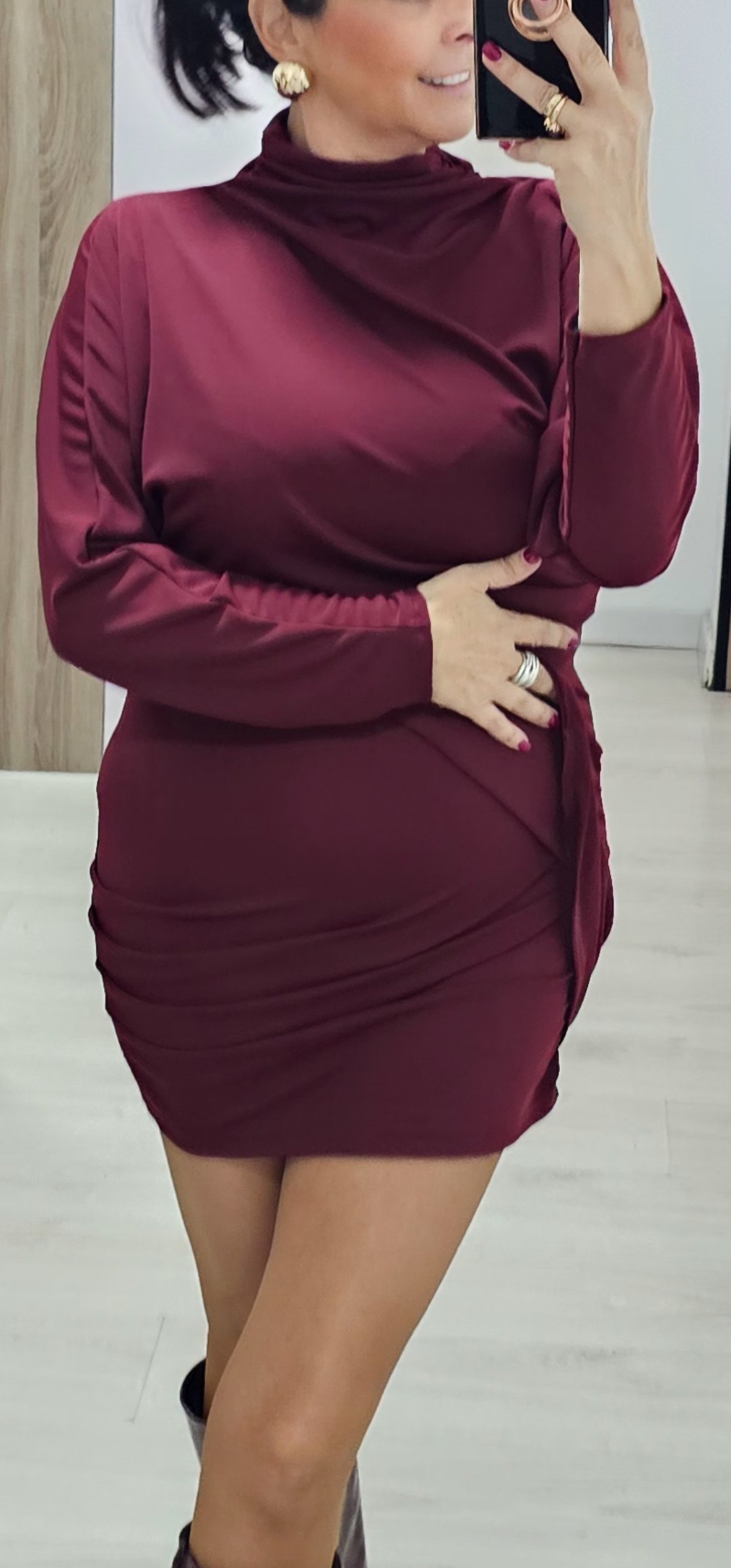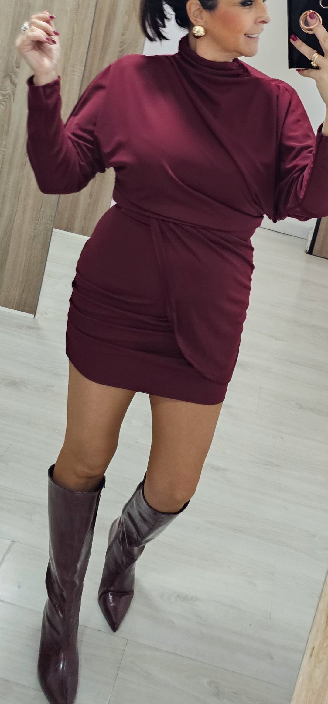Monisimo y sexy vestido corto en tejido de viscosa con licra con un corte oversance por arriba y estrecho por abajo con mangas de murciélago y corte cejado