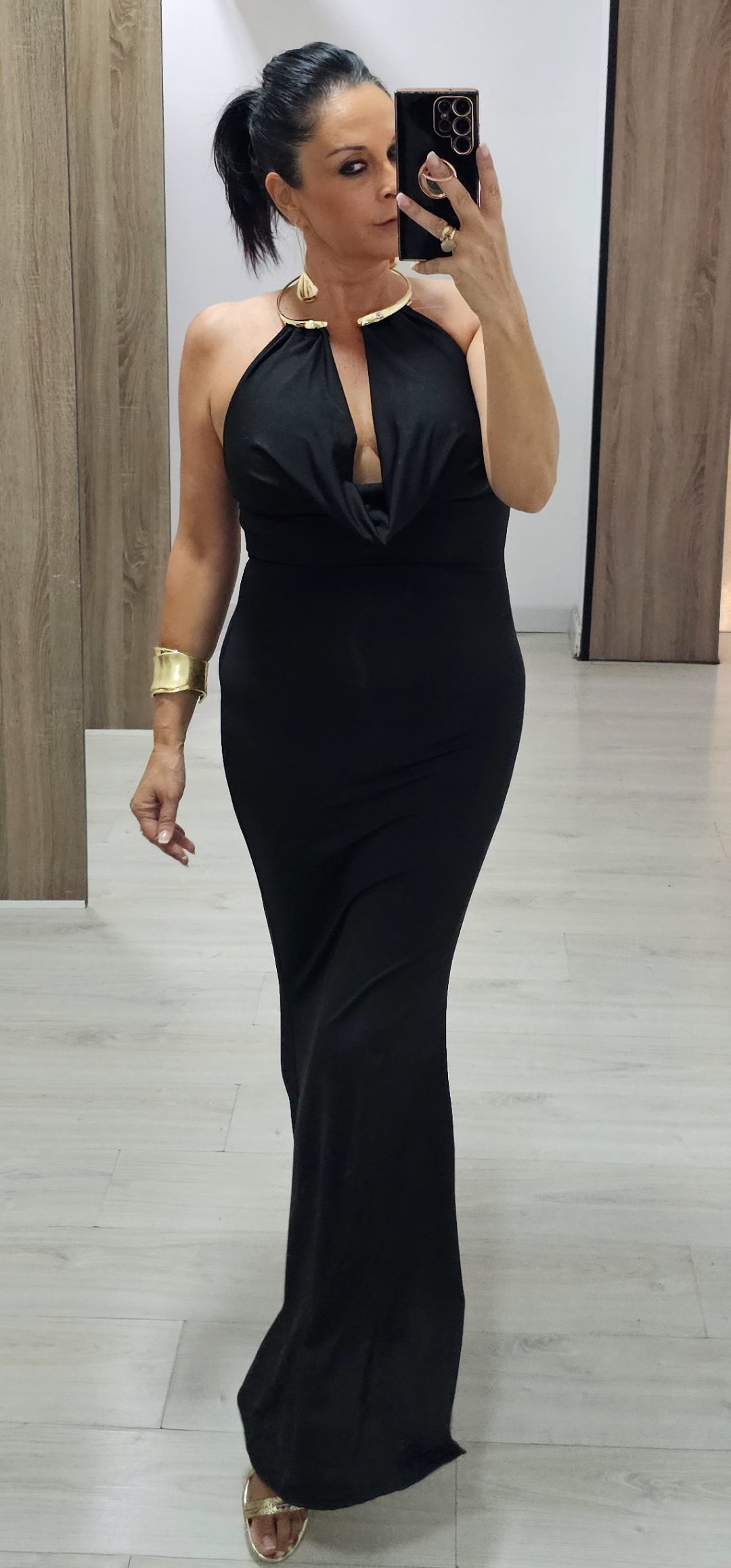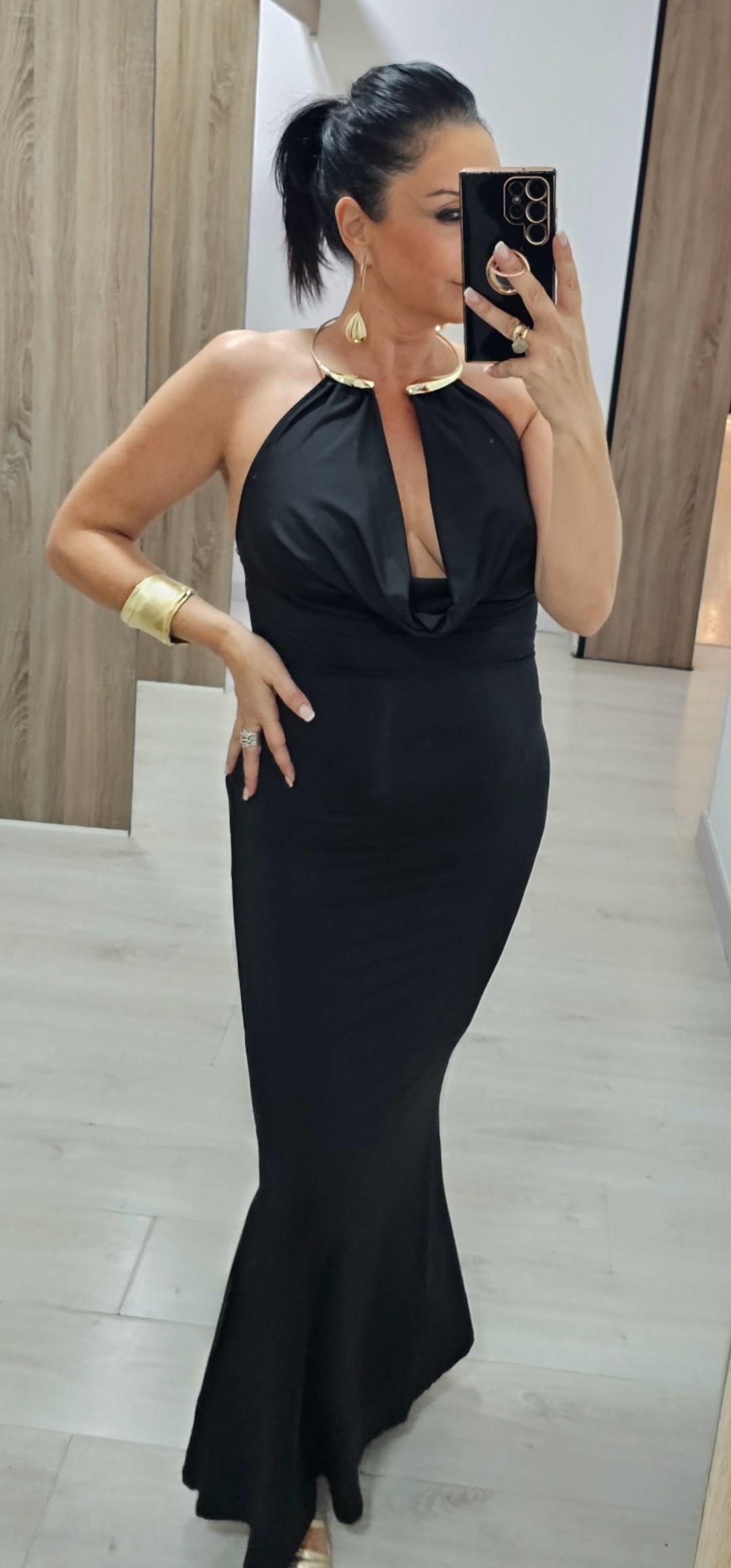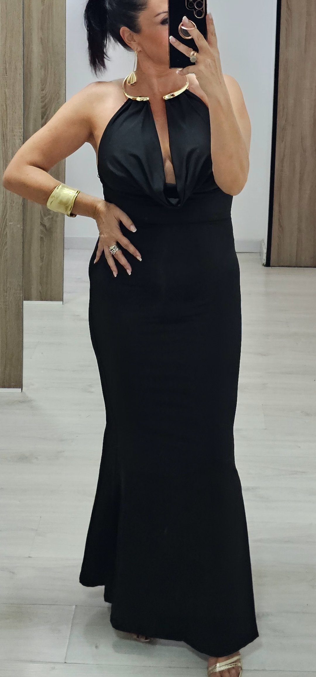 Monisimo vestido largo en tejido de licra tupida con un corte súper elegante y sexy rl escote de cascada es espectacular con collar dorado