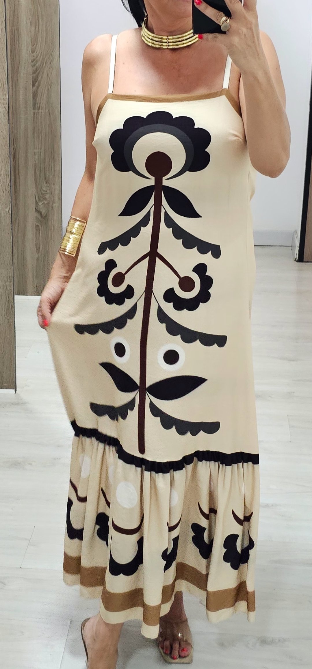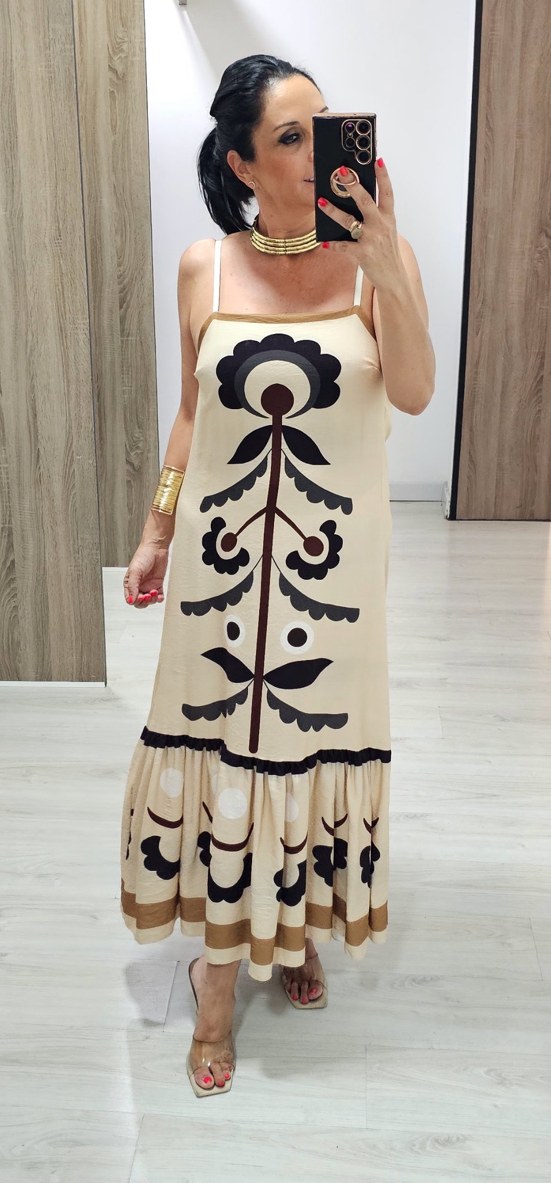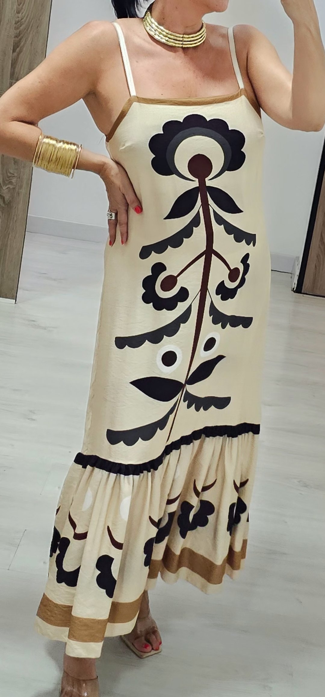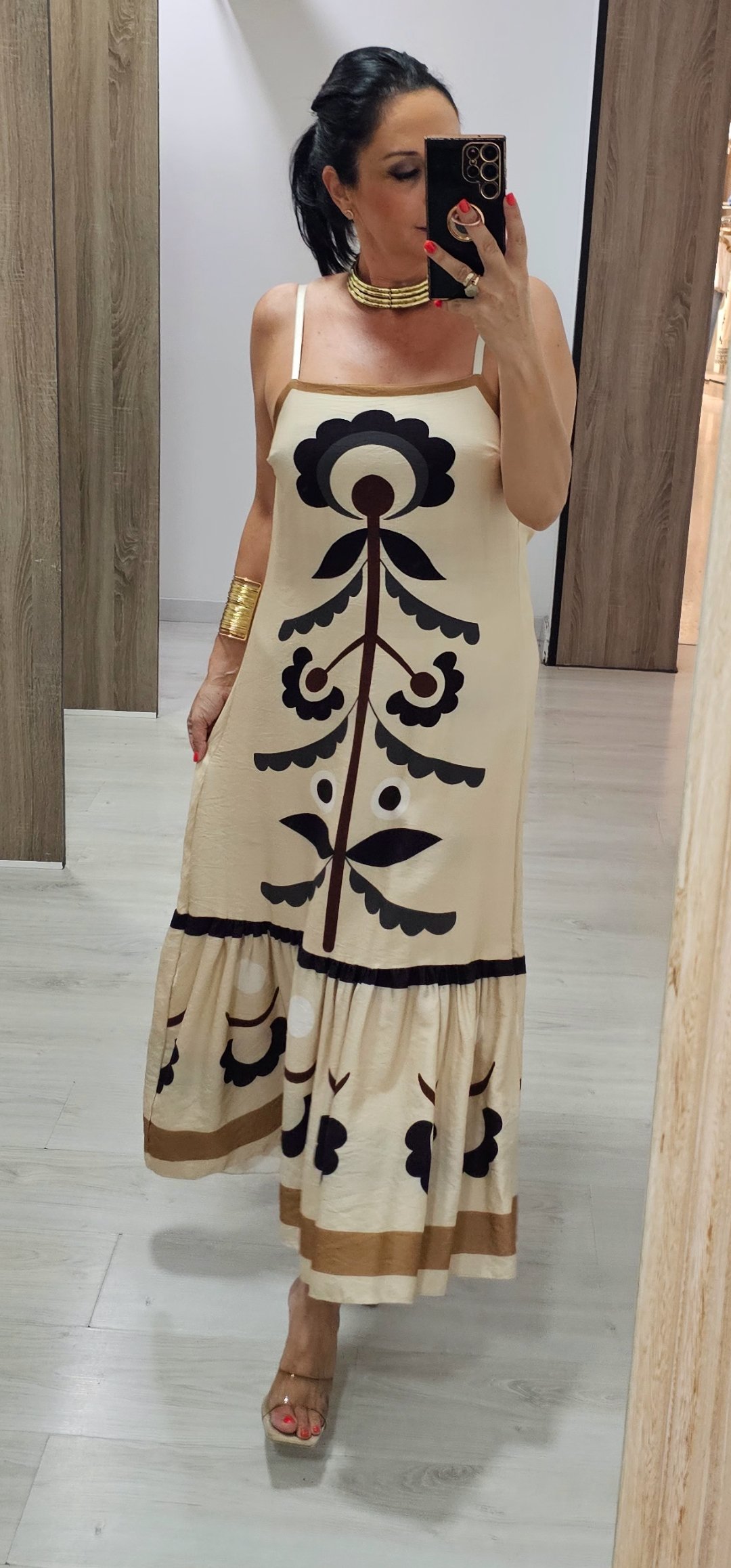 Espectacular vestido largo con un estampado súper bonito en tejido de viscosa y tirantas regulables