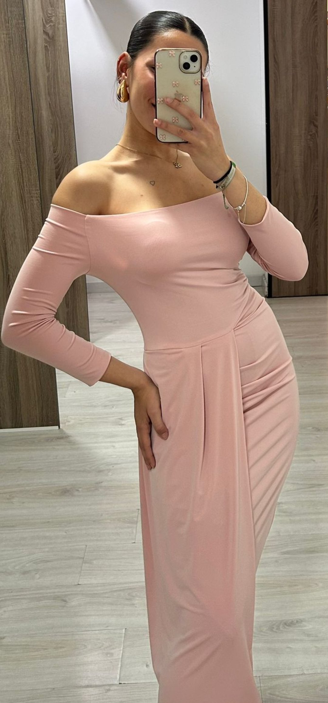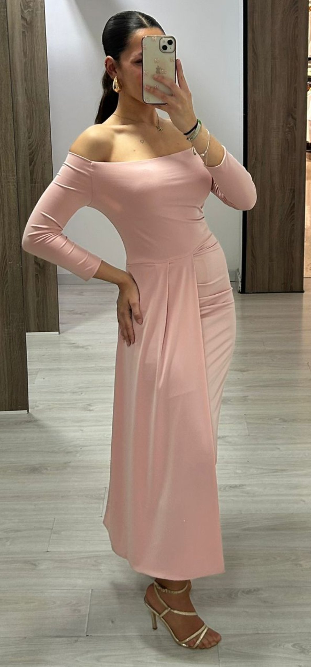 Espectacular vestido midi ideal para BBC con un diseño súper elegante y bonito con hombros descubierto y tablón en el lado,cierre de cremallera tejido de punto elástico y forrado. Fabricación Nacional
