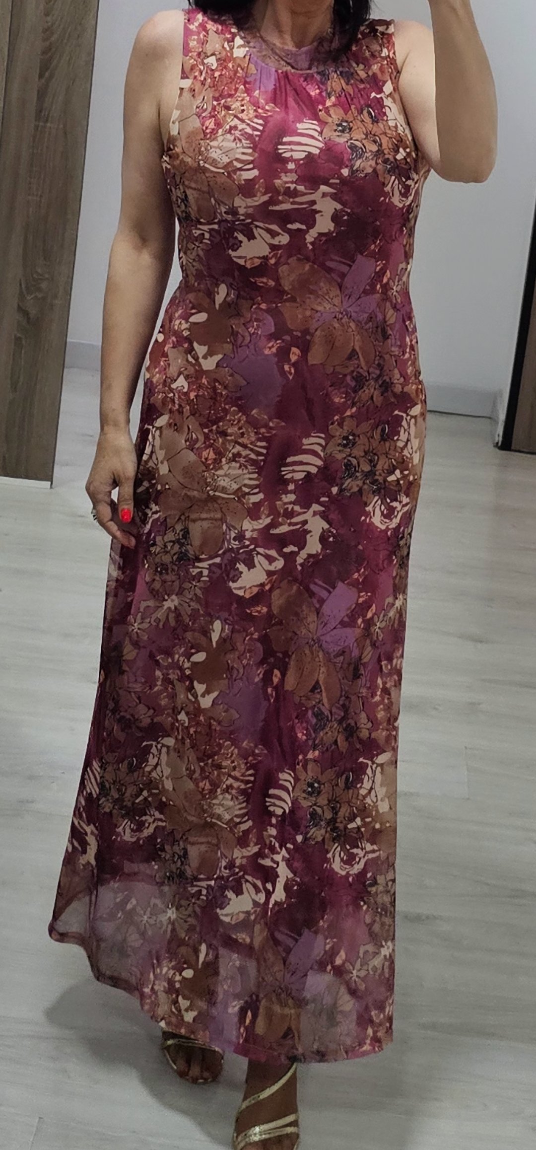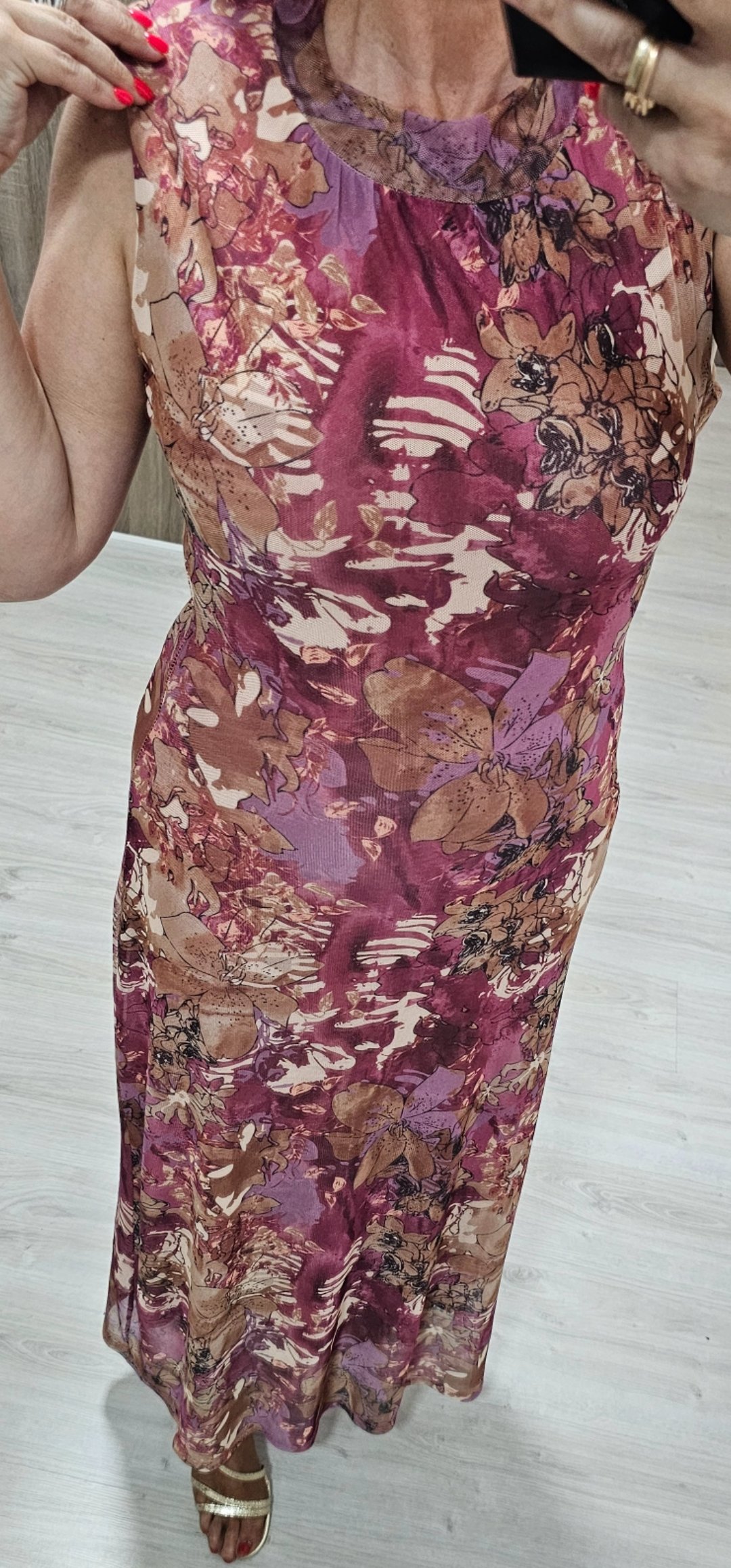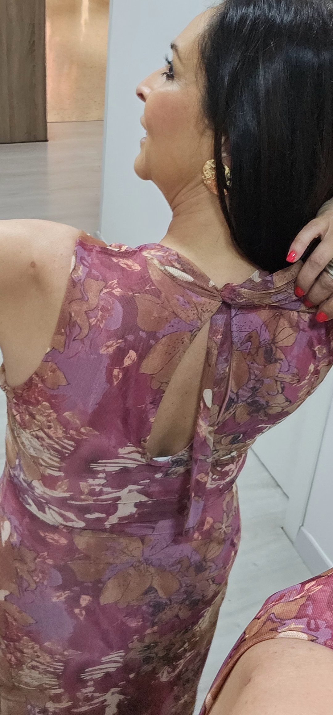 Monisimo vestido largo en tejido de tull elástico y forrado con lazada detrás en el cuello