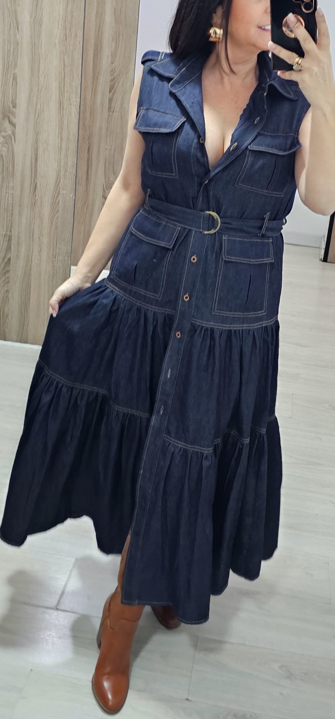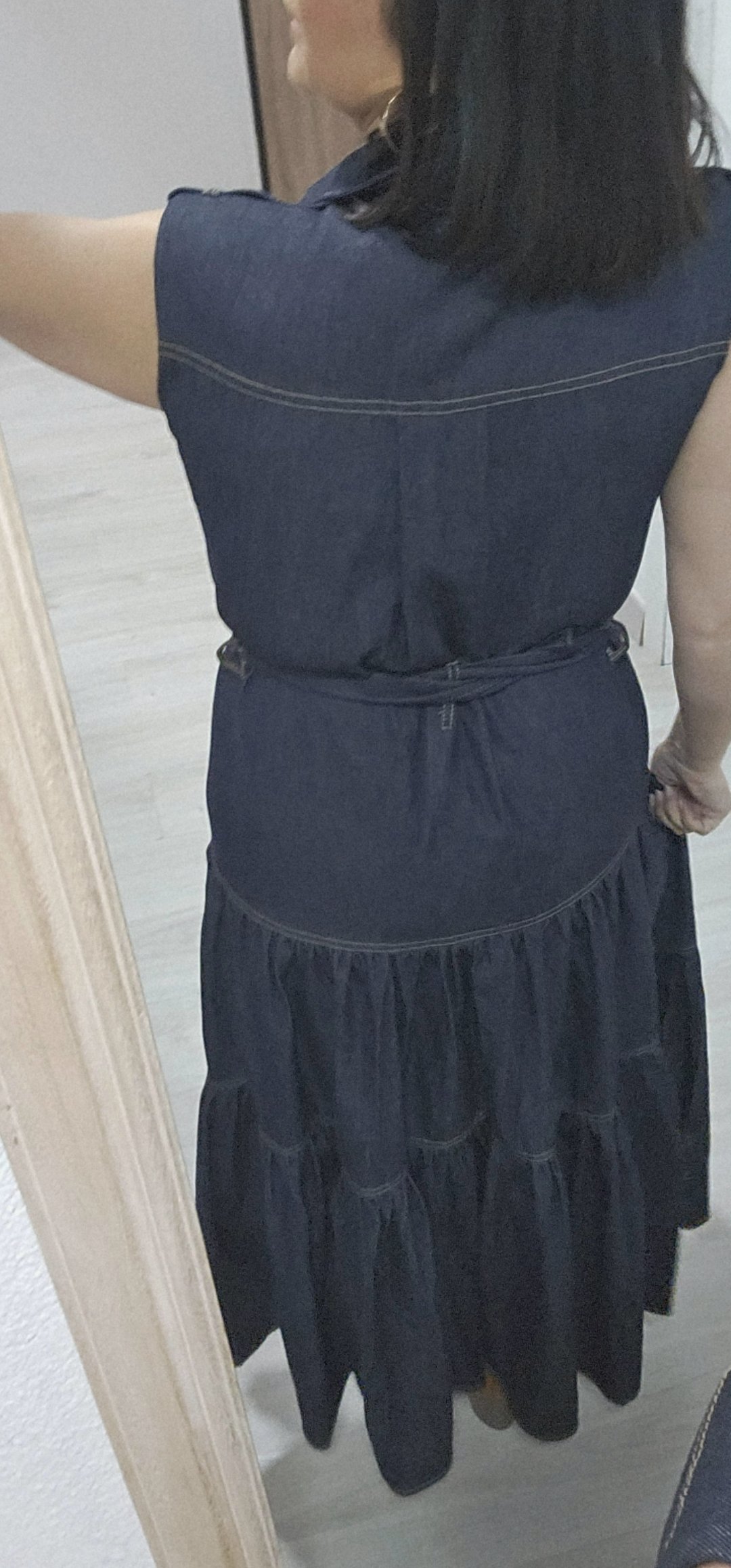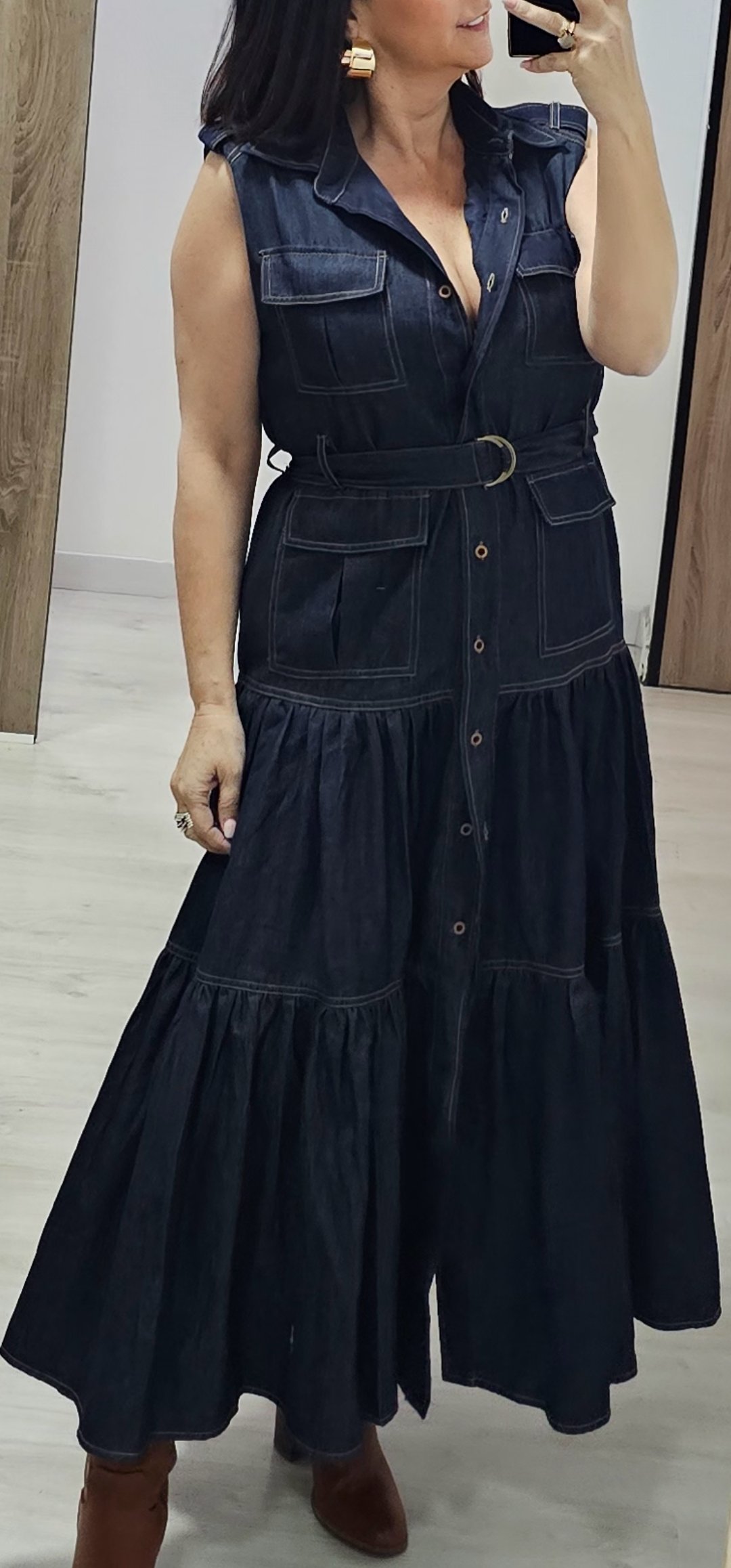 Espectacular vestido midi en tejido vaquero con corte camisero y tipo canastero, trae hombreras y cinturón color vaquero oscuro