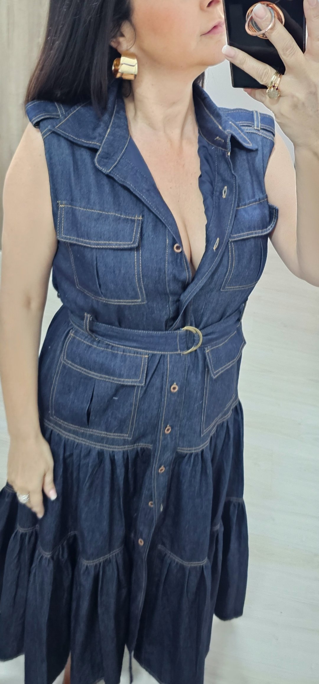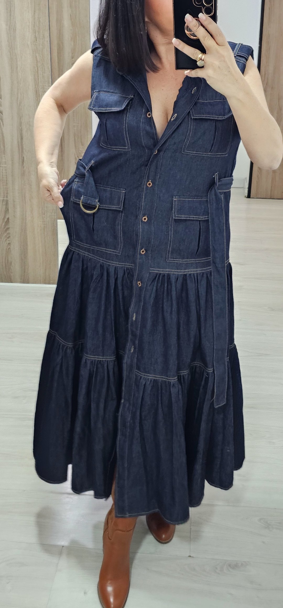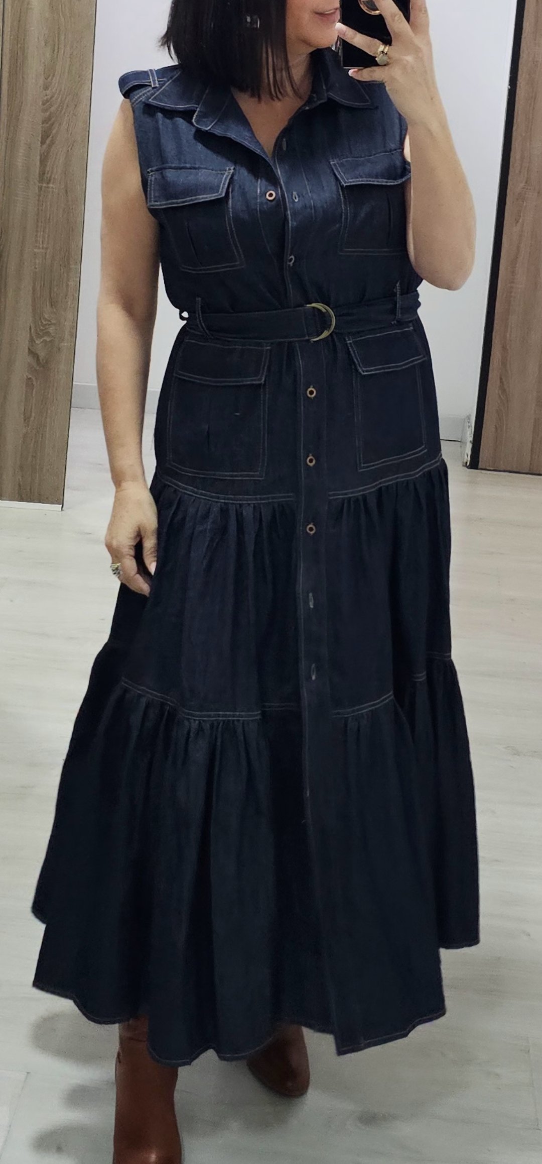 Espectacular vestido midi en tejido vaquero con corte camisero y tipo canastero, trae hombreras y cinturón color vaquero oscuro