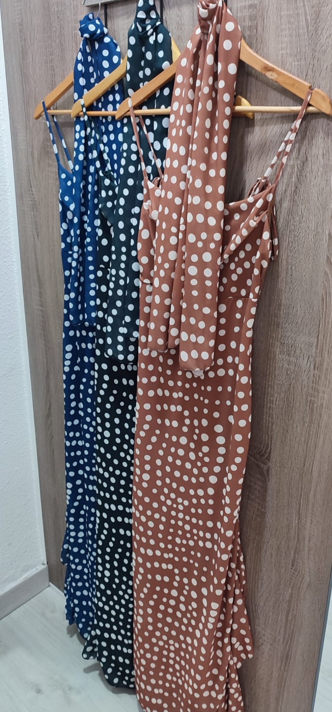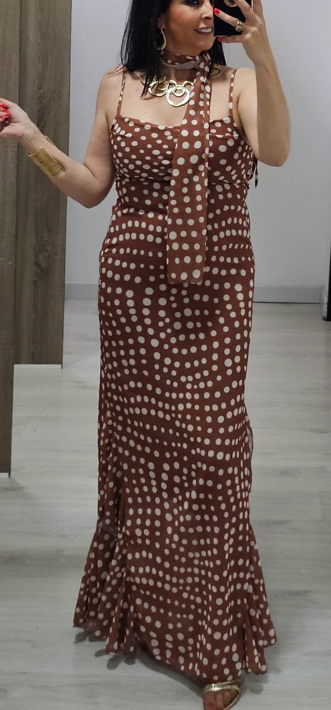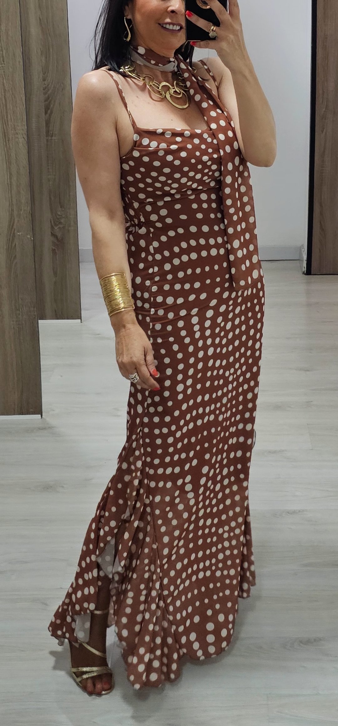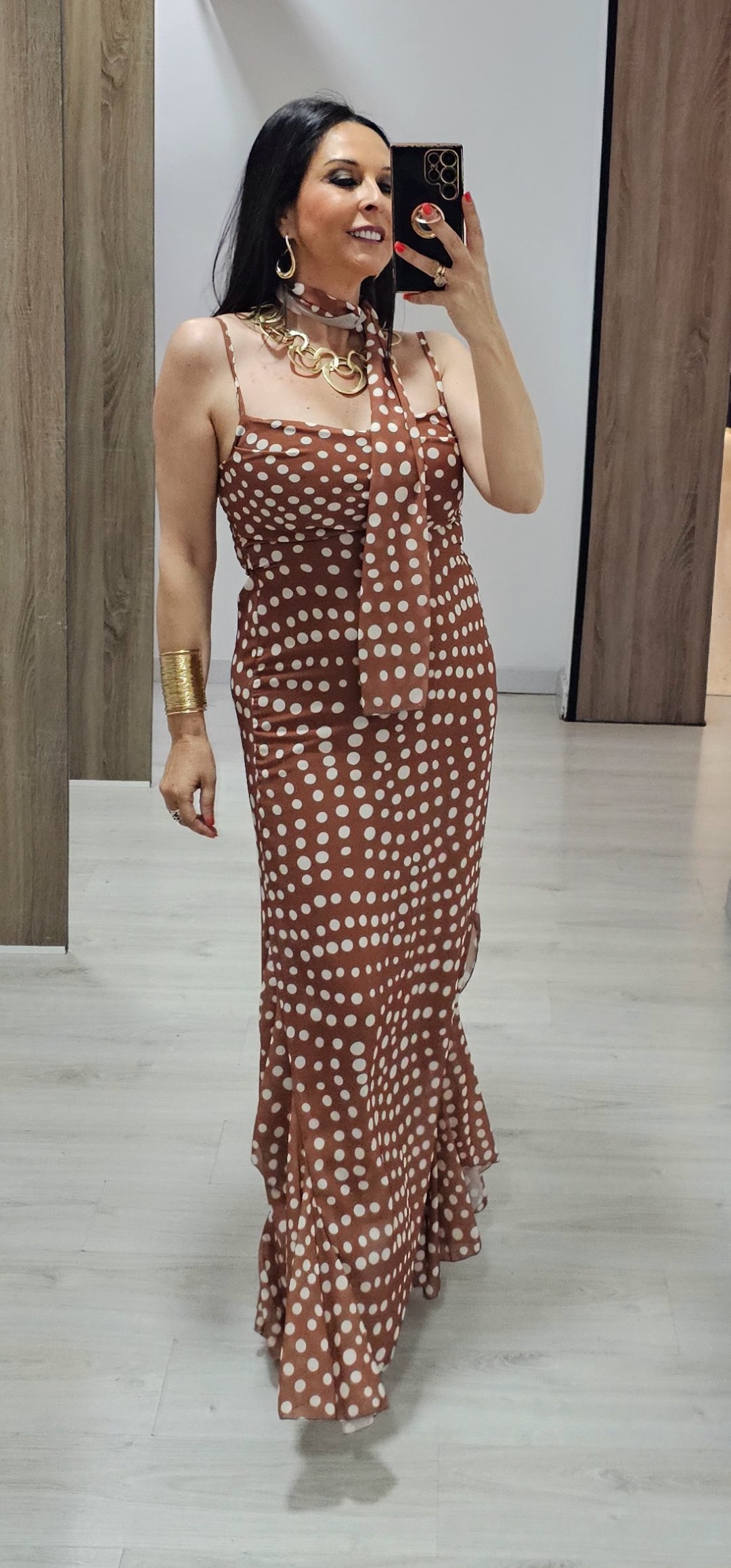 Espectacular vestido largo de lunares en tejido de gasa con tirantas regulables de lazo y mido de abeja detrás ,con terminación de volante en el bajo.Pañuelo incluido