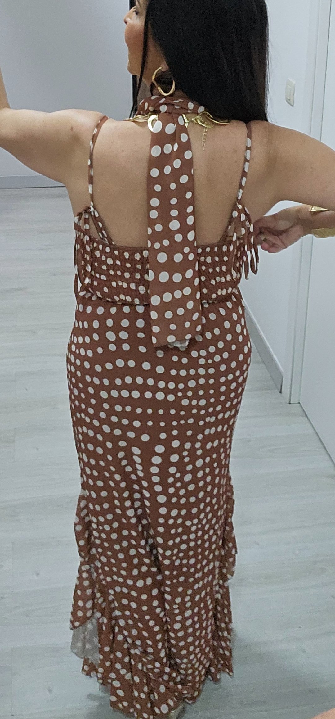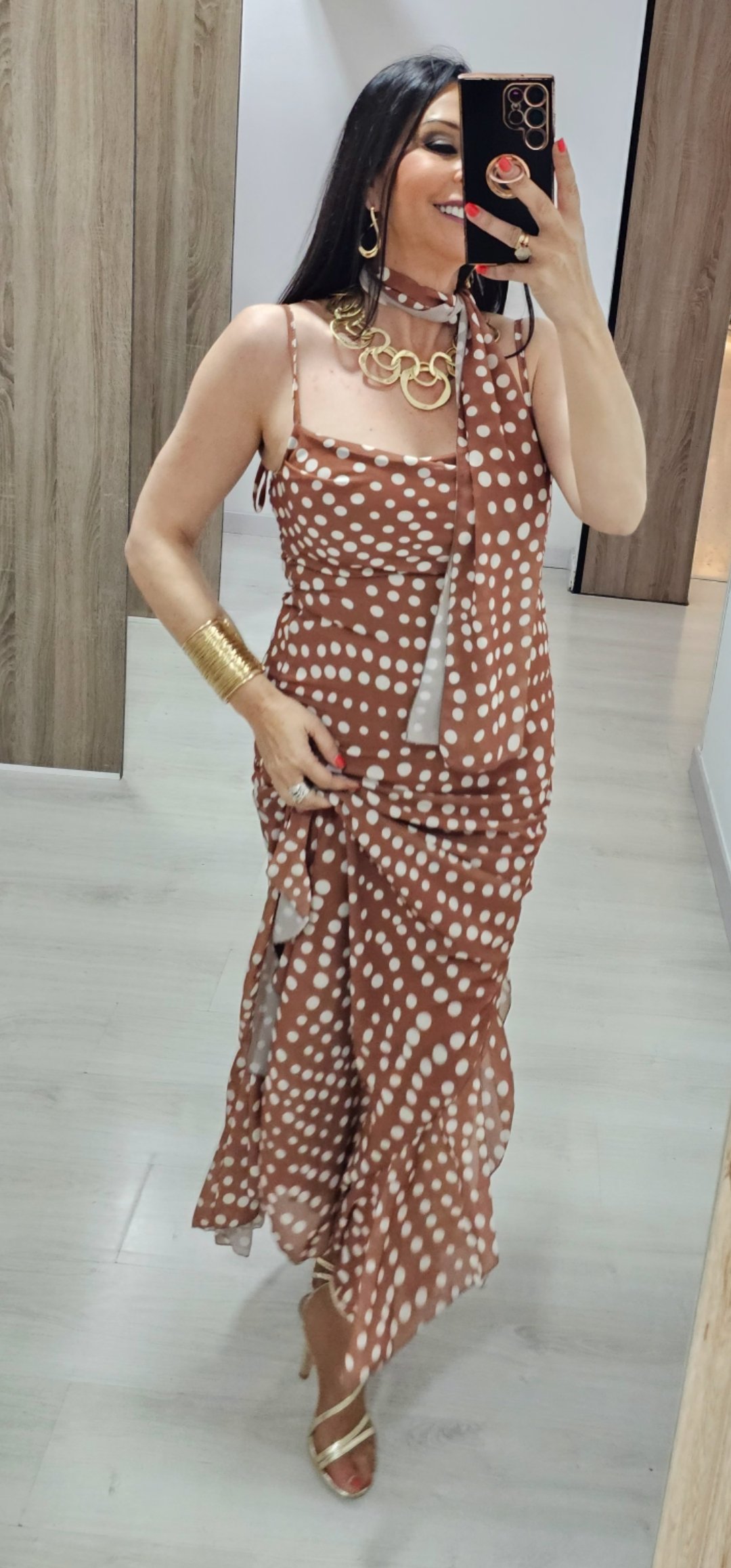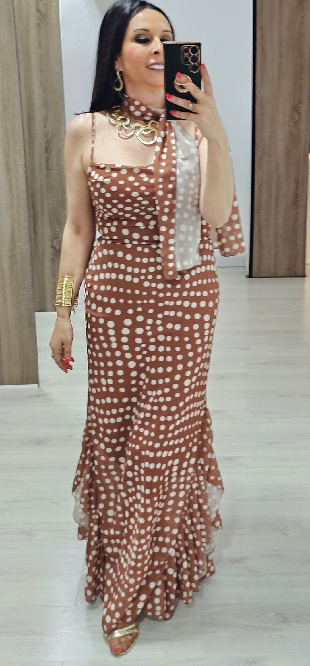 Espectacular vestido largo de lunares en tejido de gasa con tirantas regulables de lazo y mido de abeja detrás ,con terminación de volante en el bajo.Pañuelo incluido