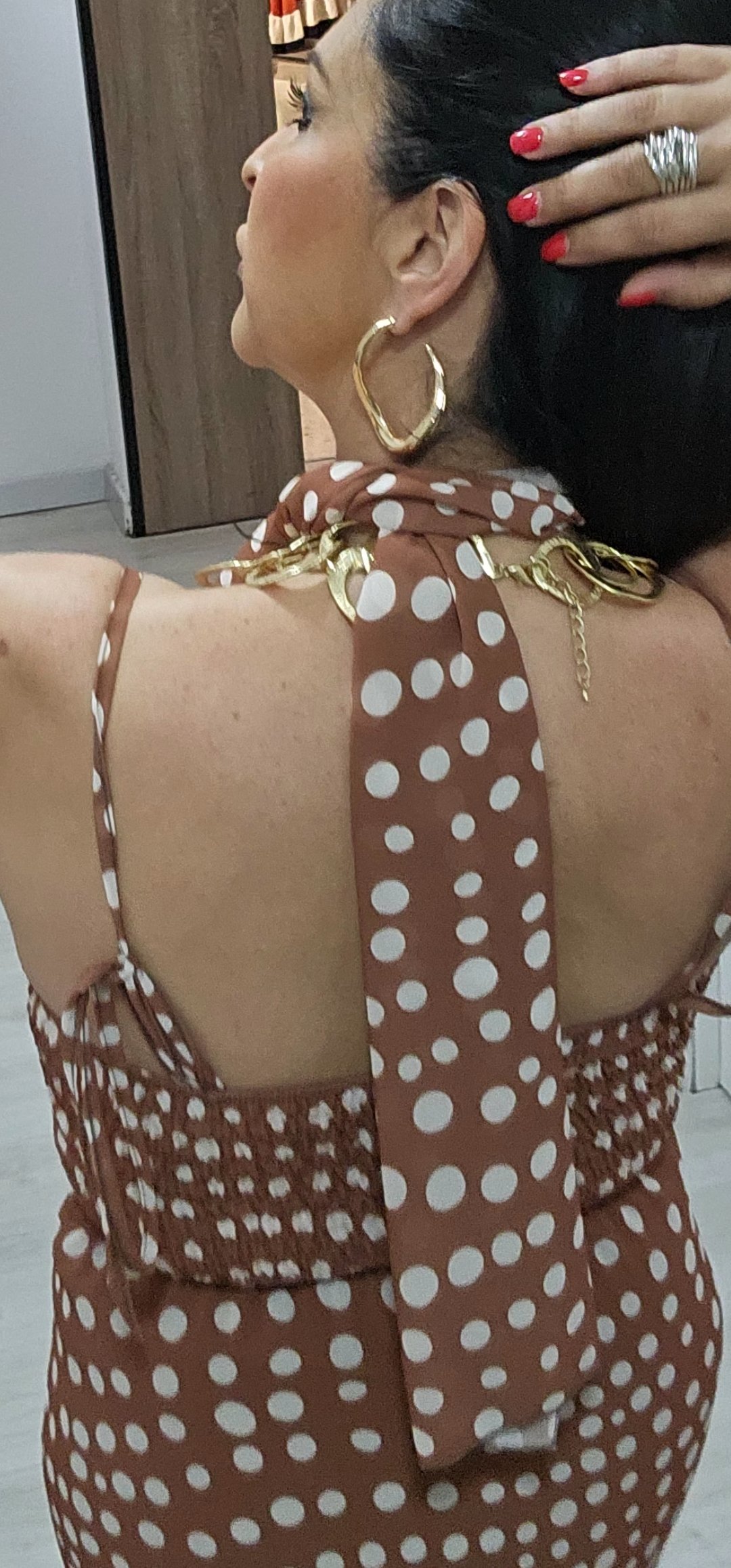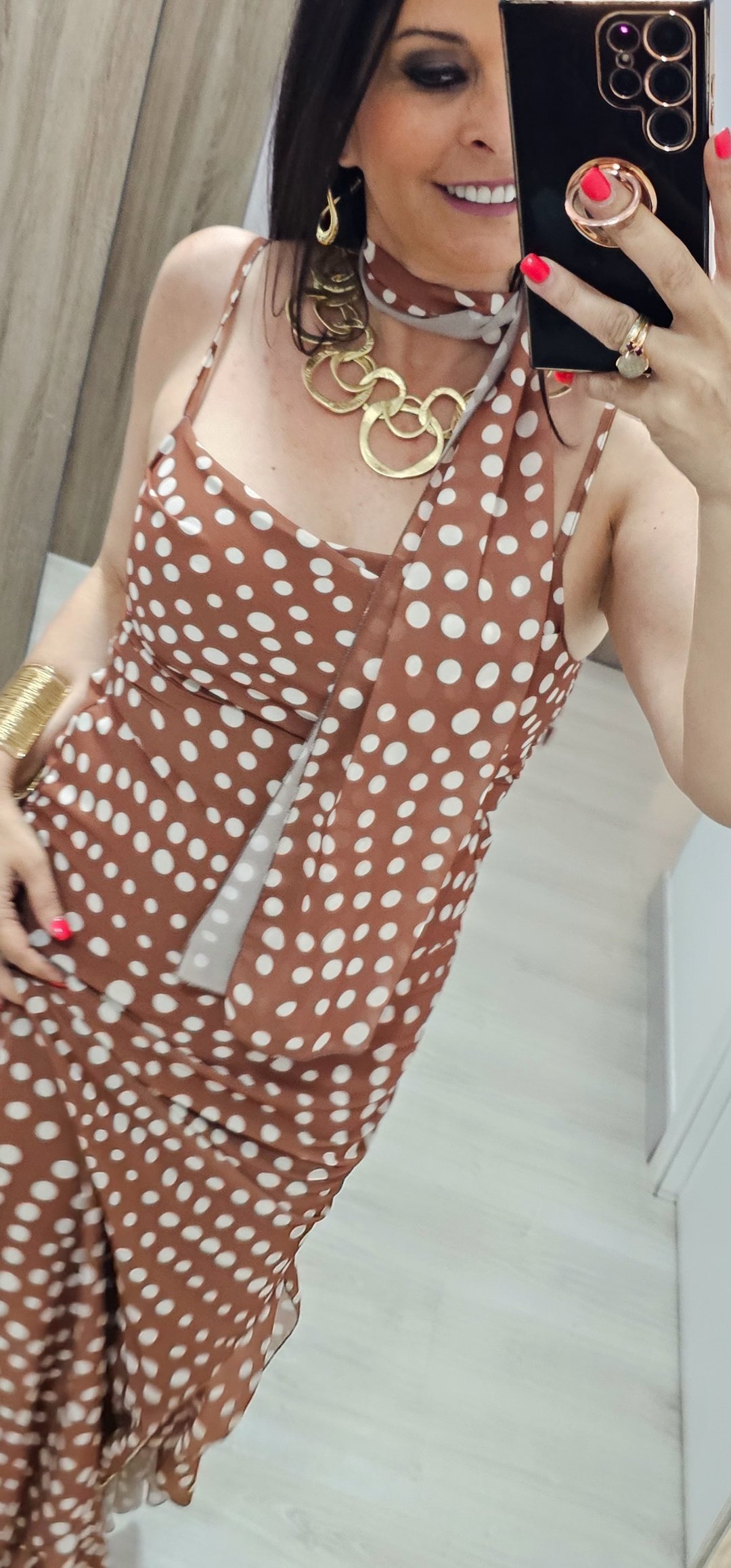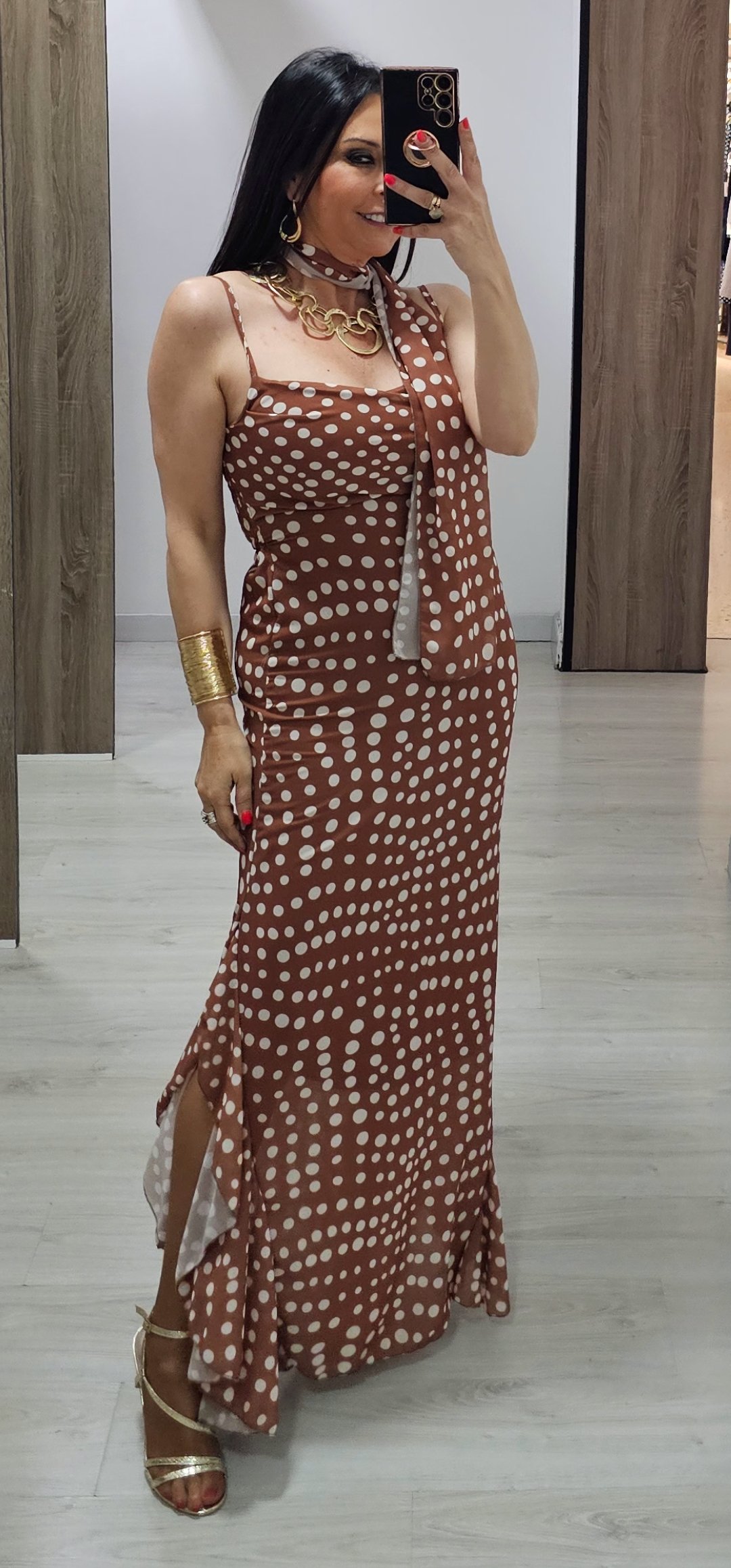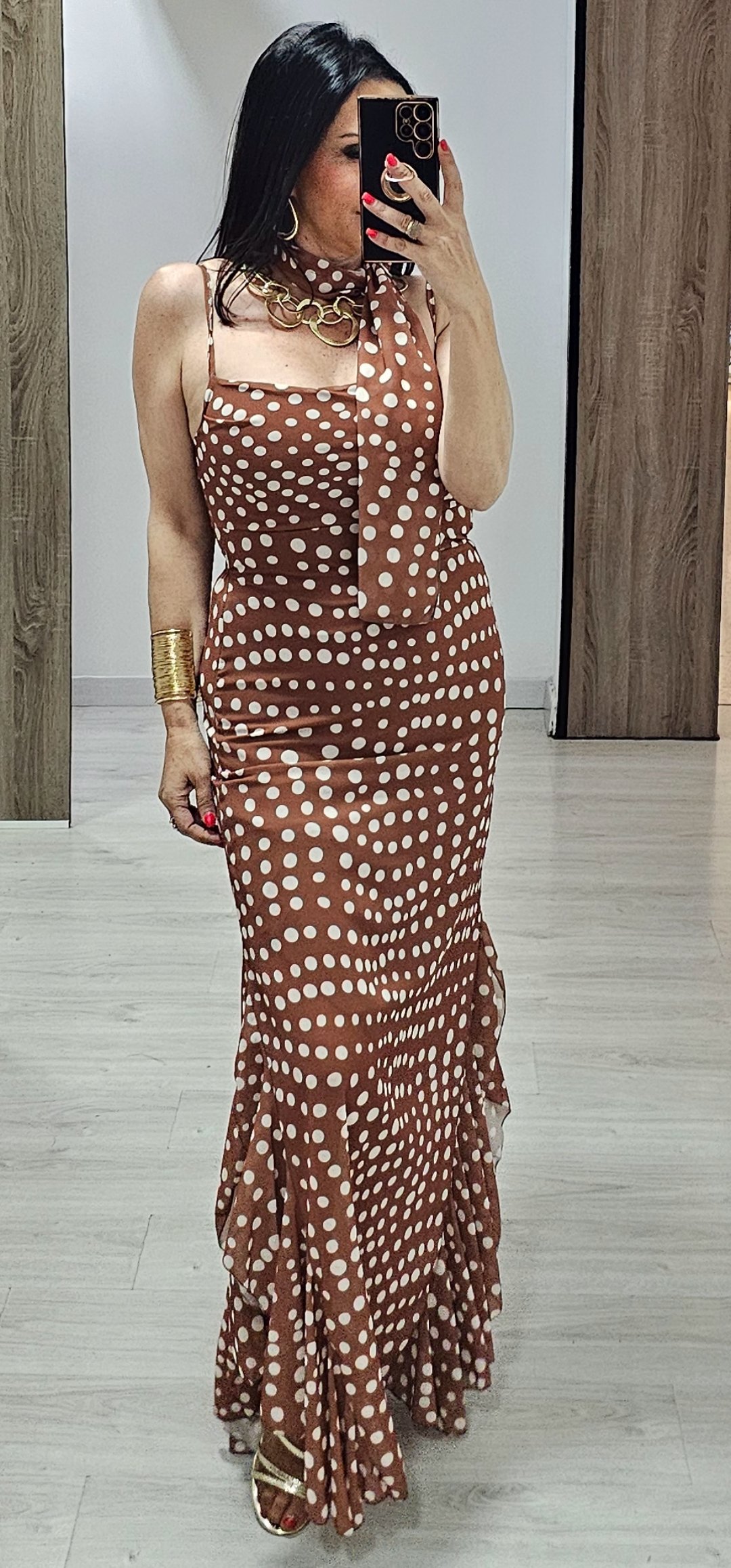 Espectacular vestido largo de lunares en tejido de gasa con tirantas regulables de lazo y mido de abeja detrás ,con terminación de volante en el bajo.Pañuelo incluido