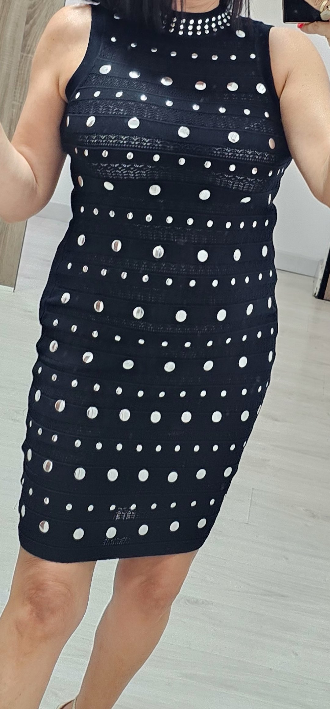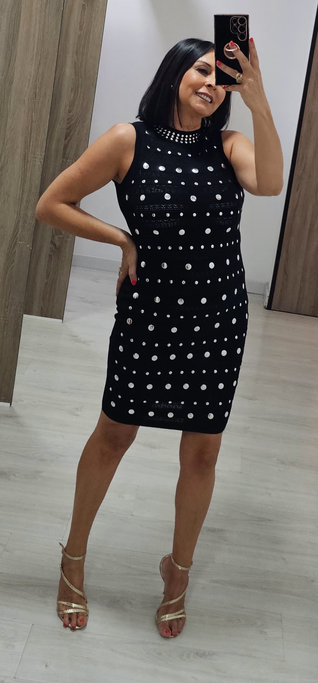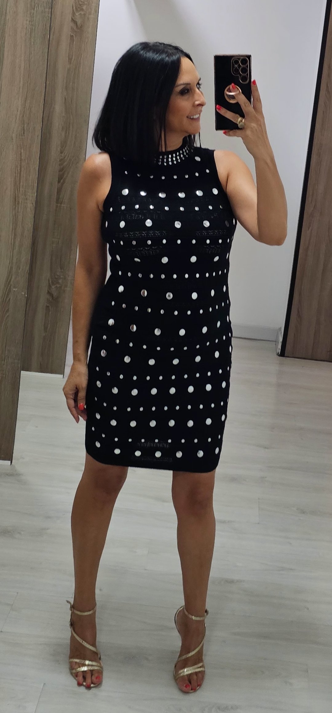 Monisimo vestido de hilo con calado por delante y apliques de tachuelas, por detrás es liso