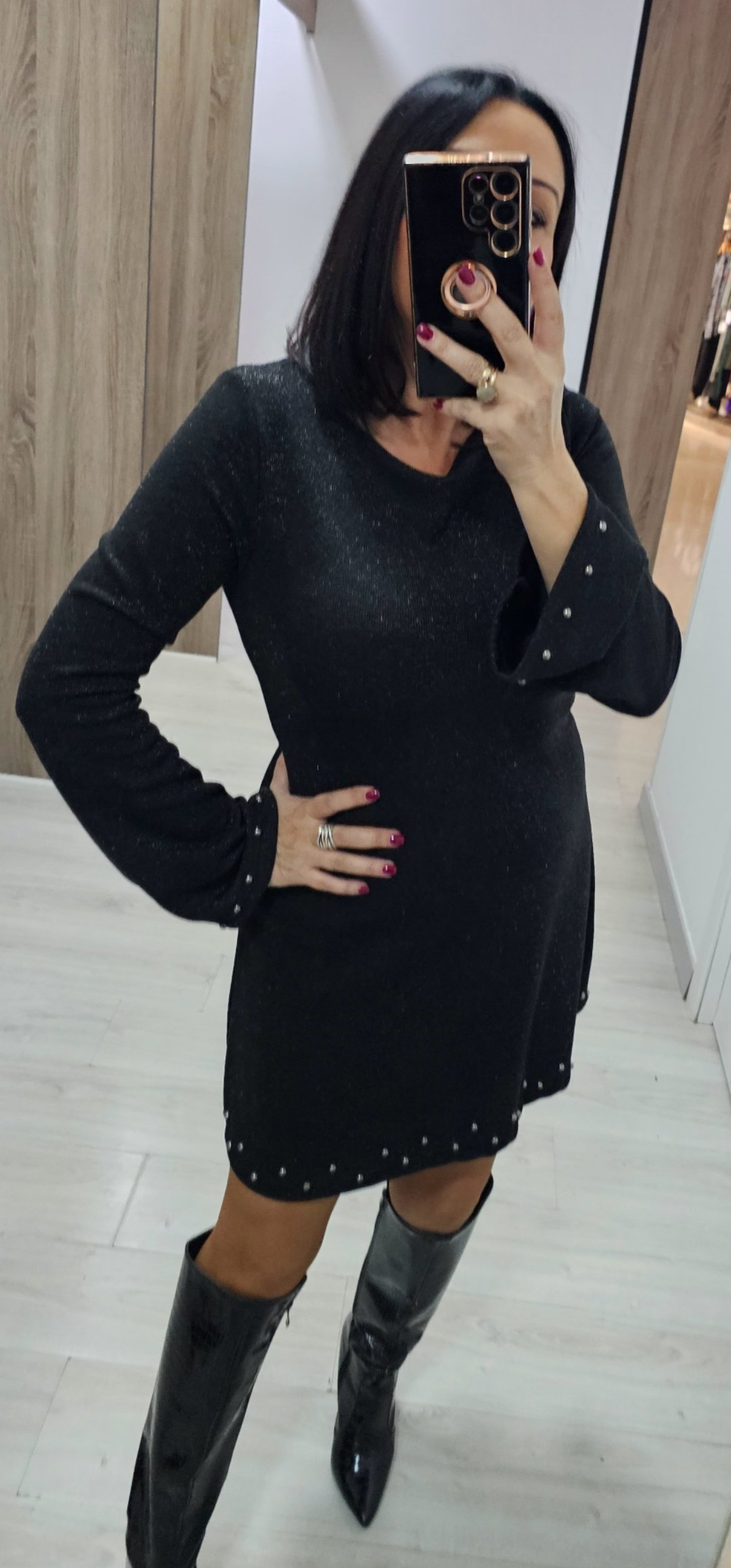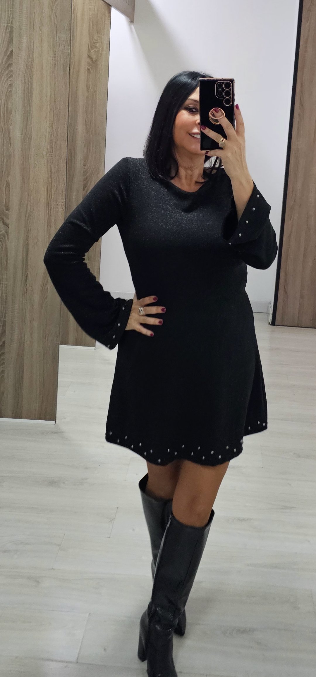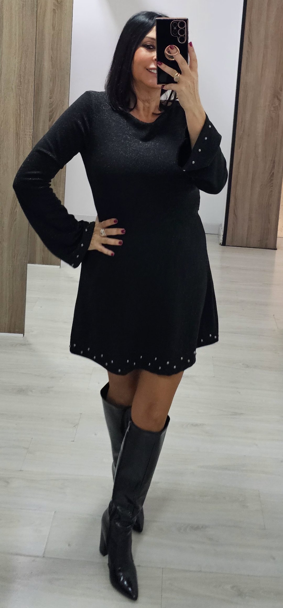 Monisimo vestido de punto elastico con brillo con adorno de tachuelas en los filos con mangas acampanada