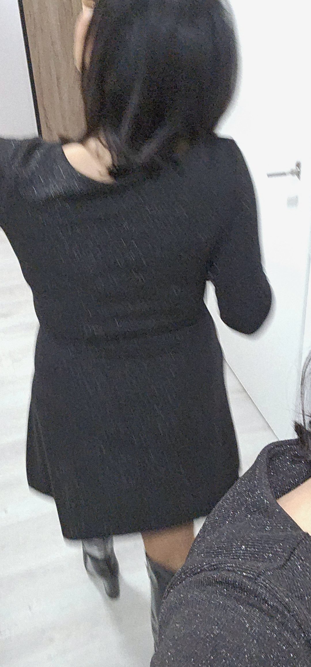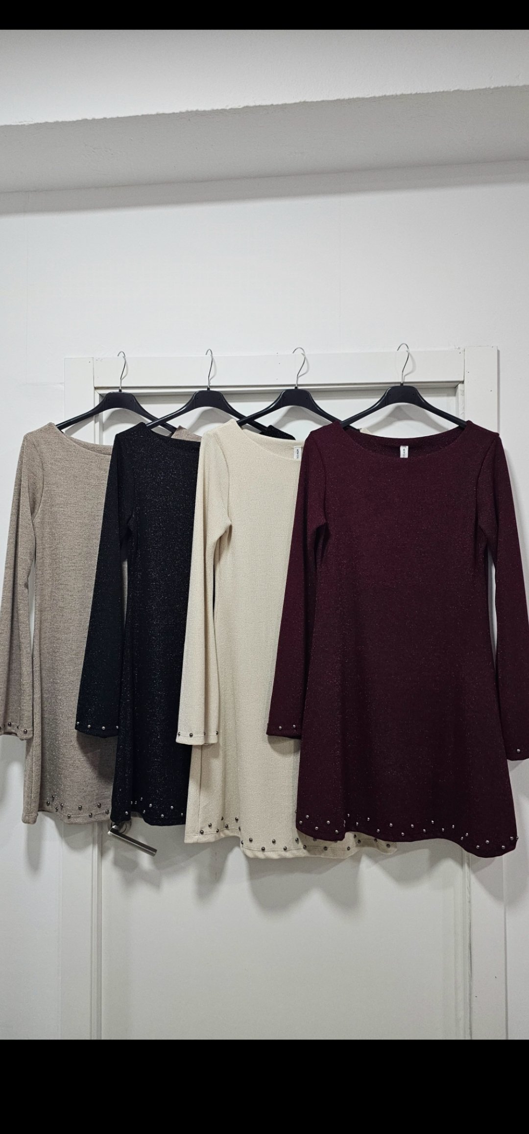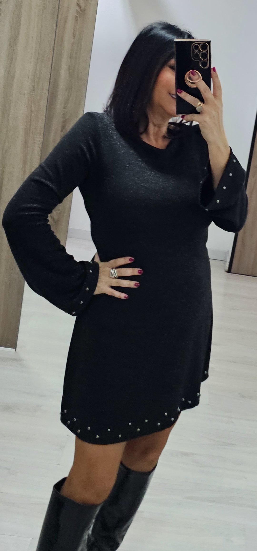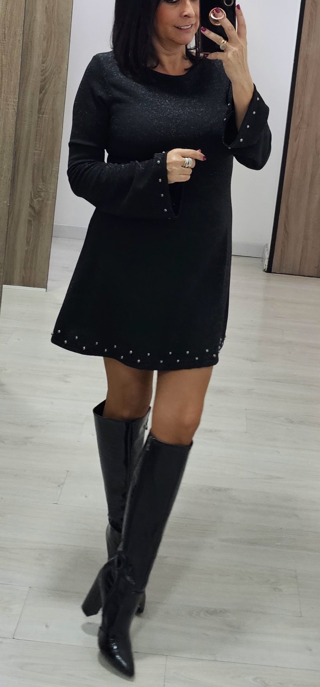 Monisimo vestido de punto elastico con brillo con adorno de tachuelas en los filos con mangas acampanada