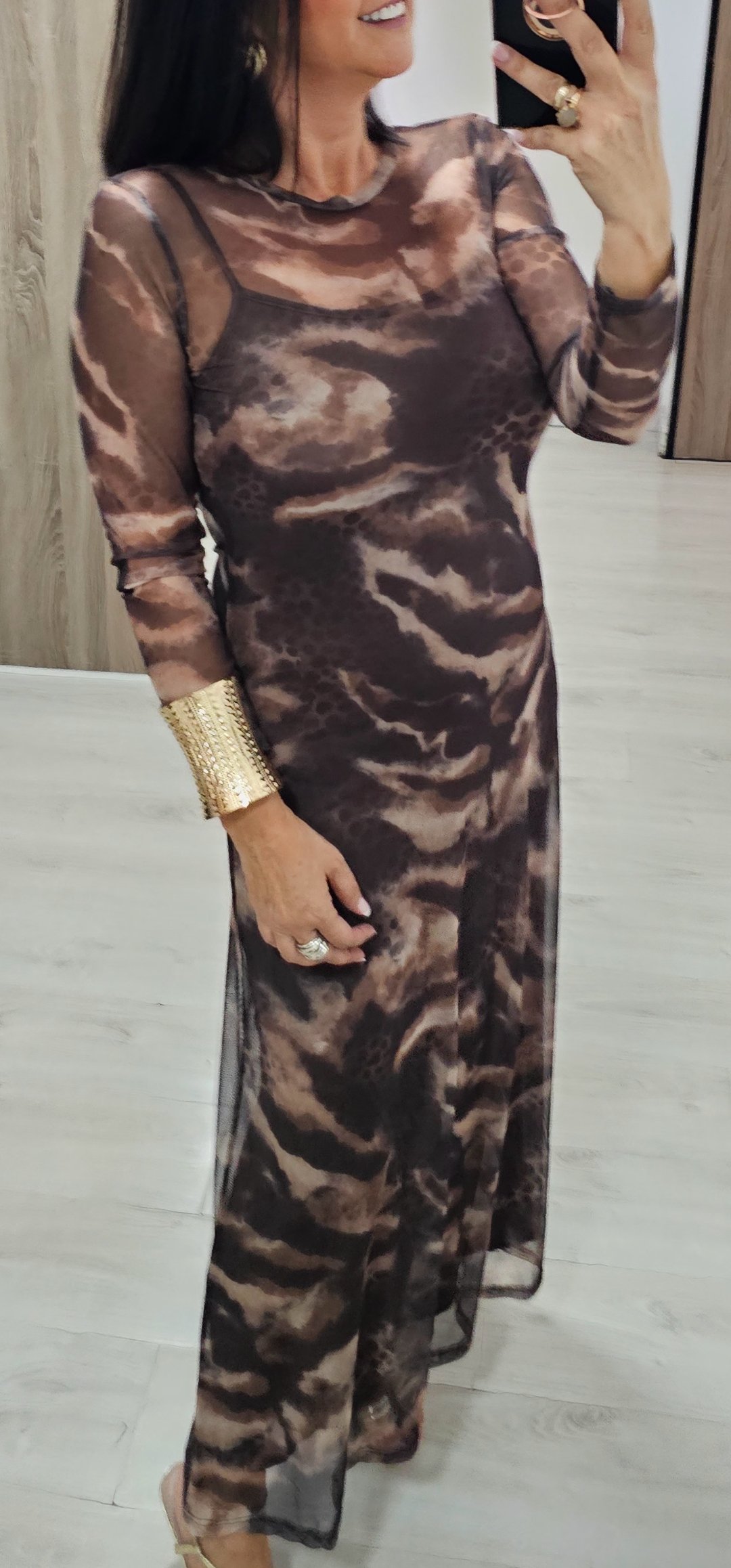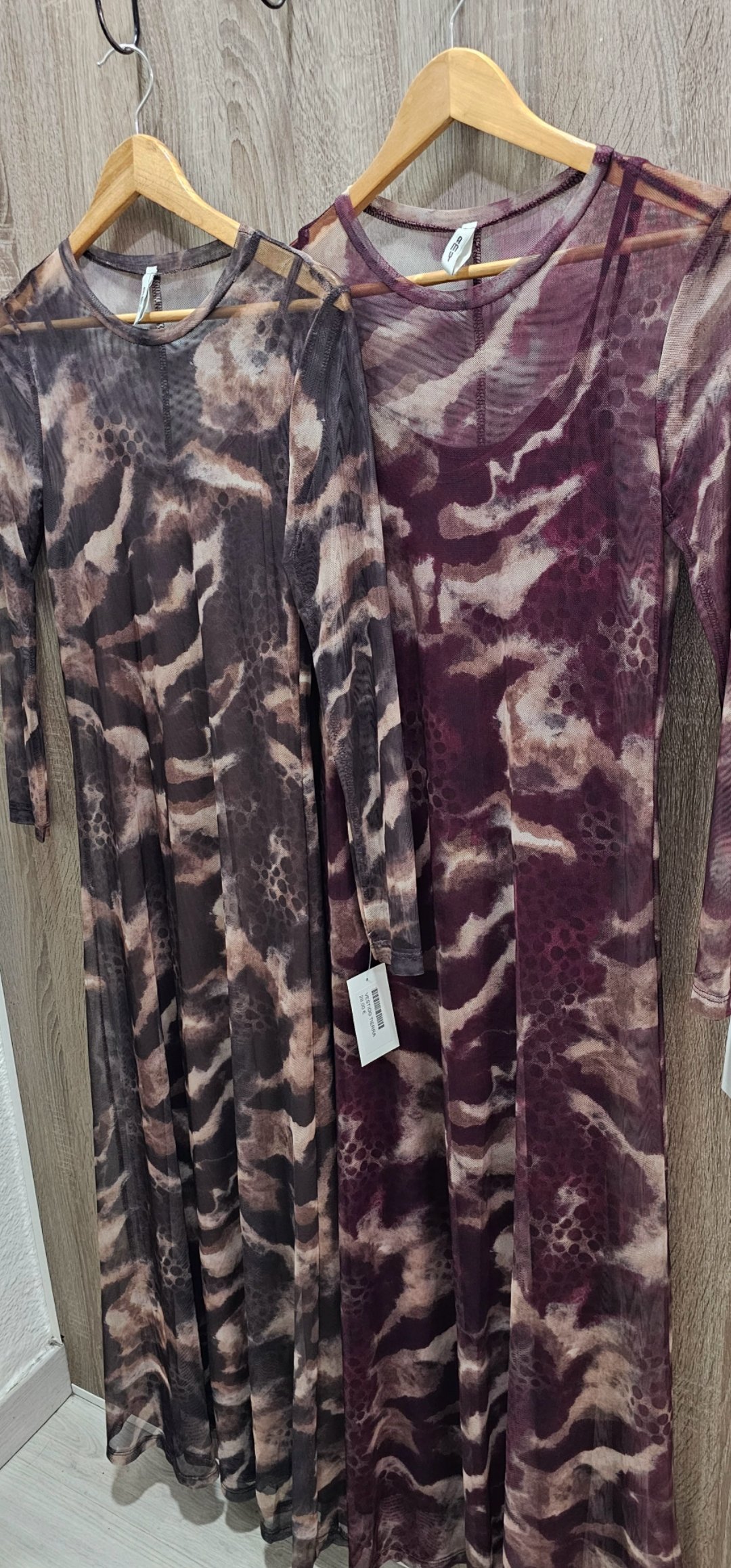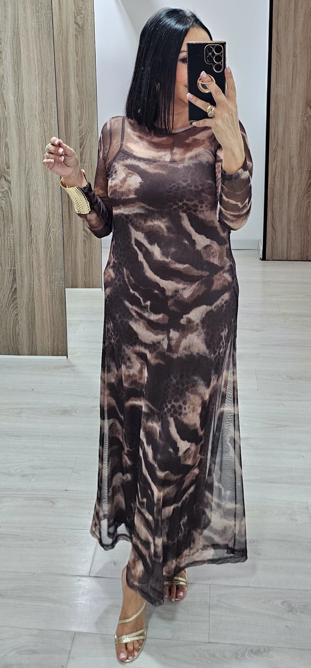 Espectacular vestido largo en tejido de tull elástico con mangas largas y forro de tintas súper cómodo y elegante