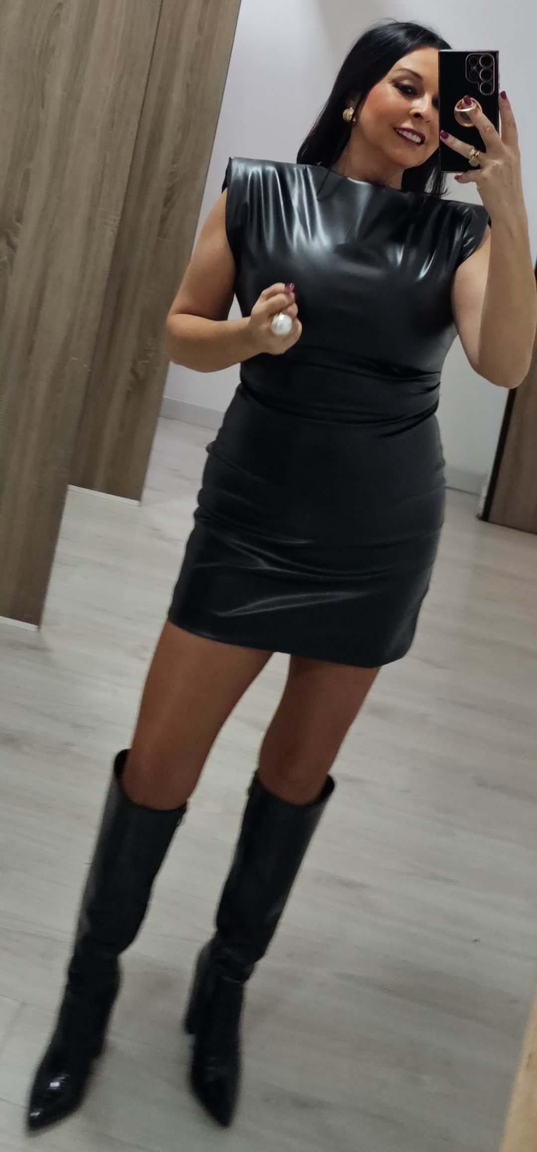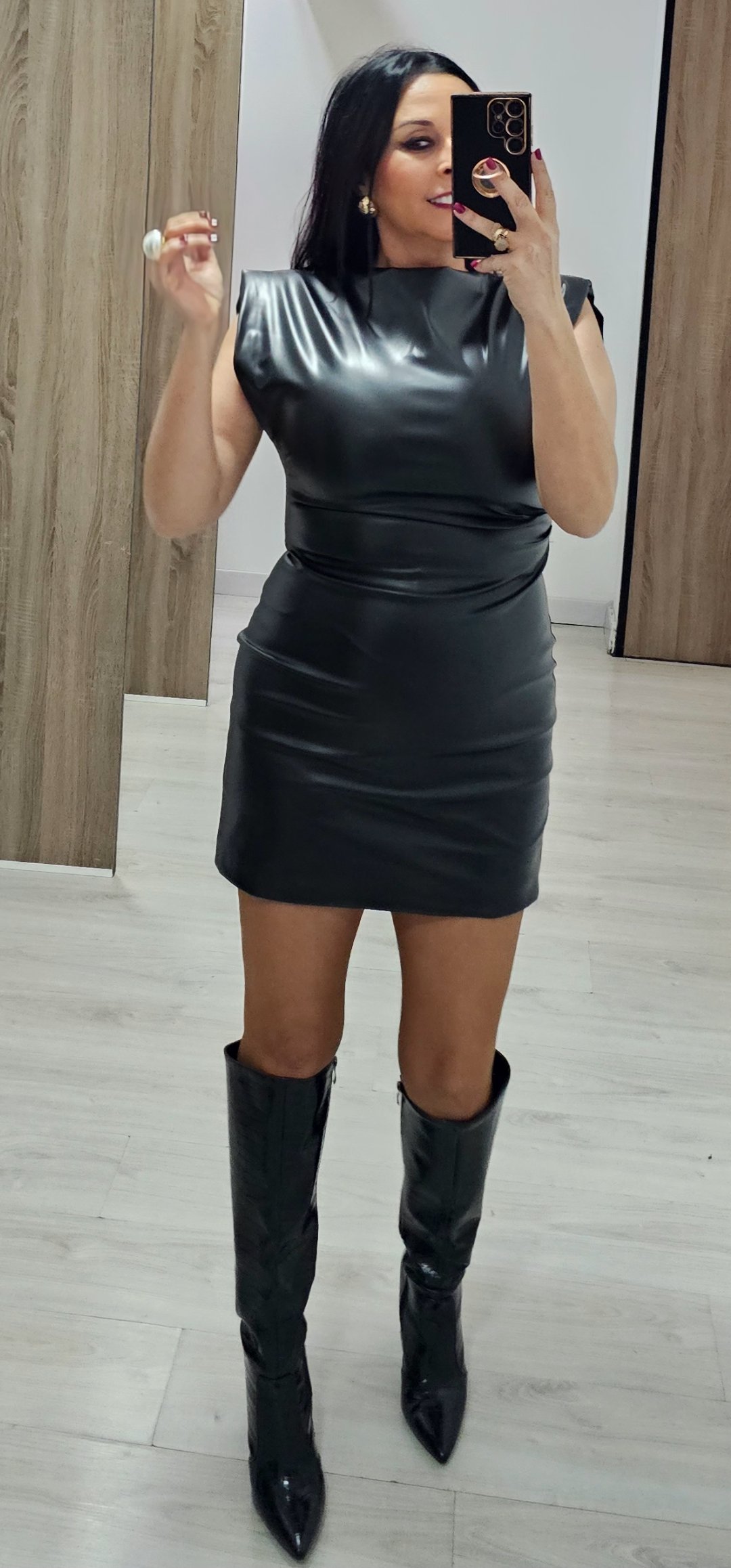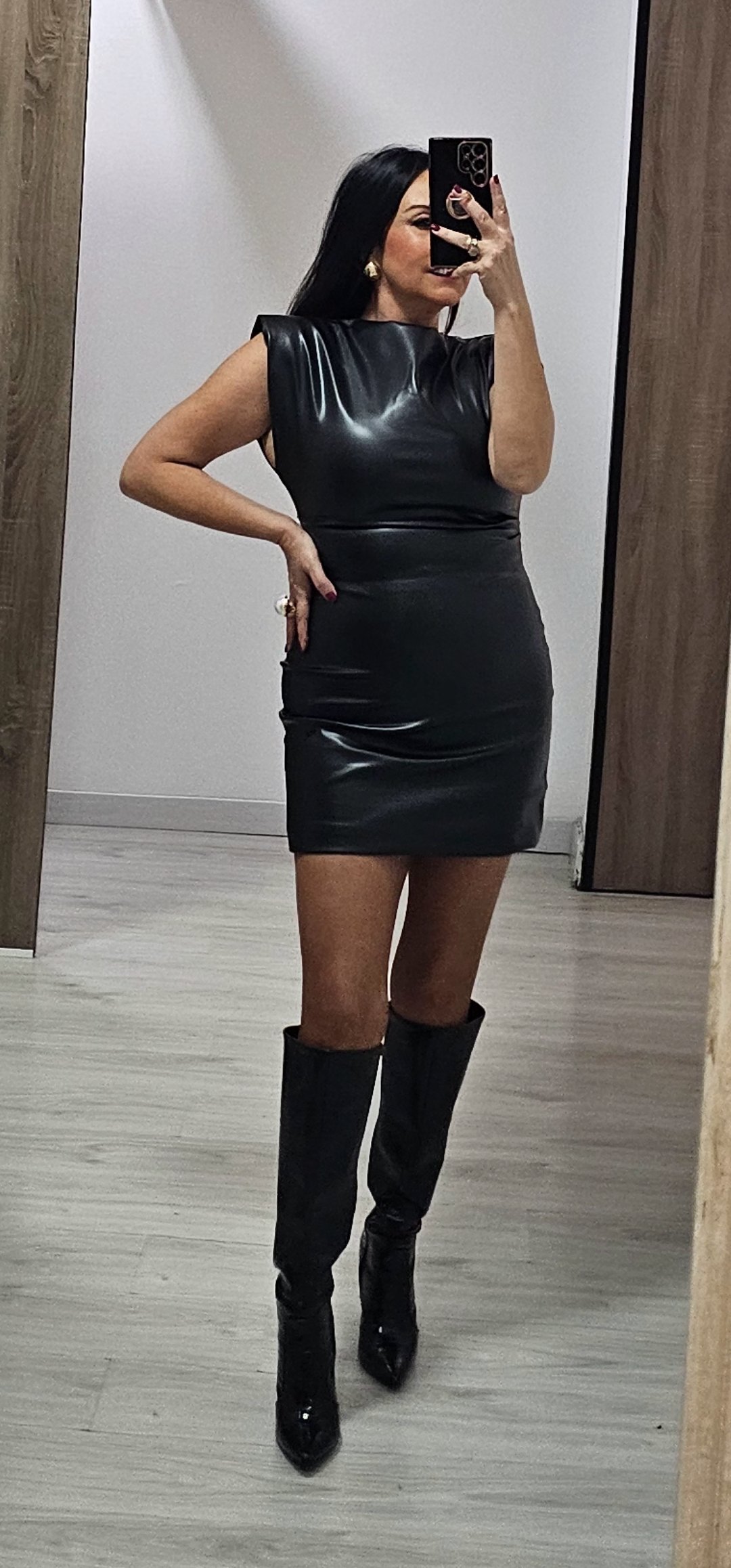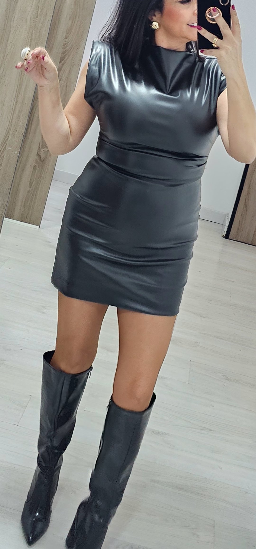Espectacular vestido corto en tejido de polipiel flexible con forro incluido cierre de cremallera detrás y hombreras