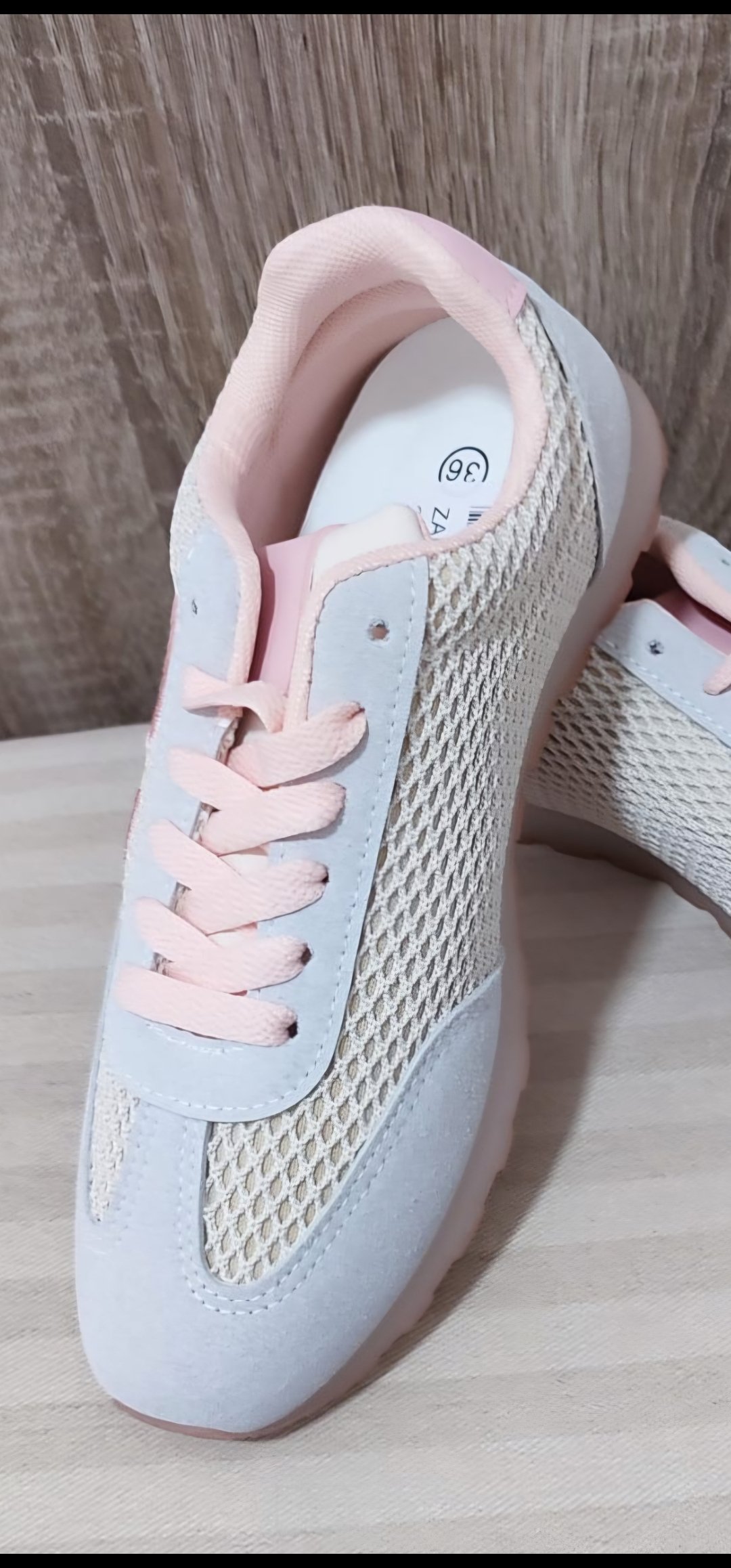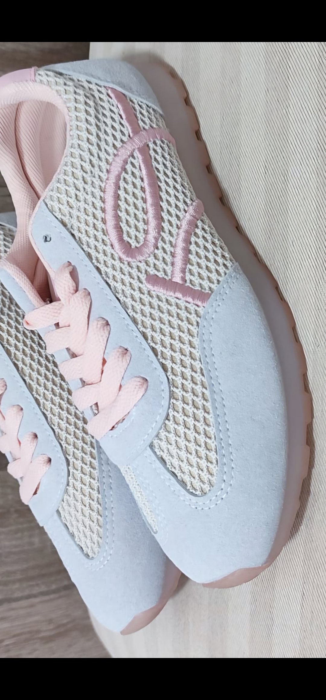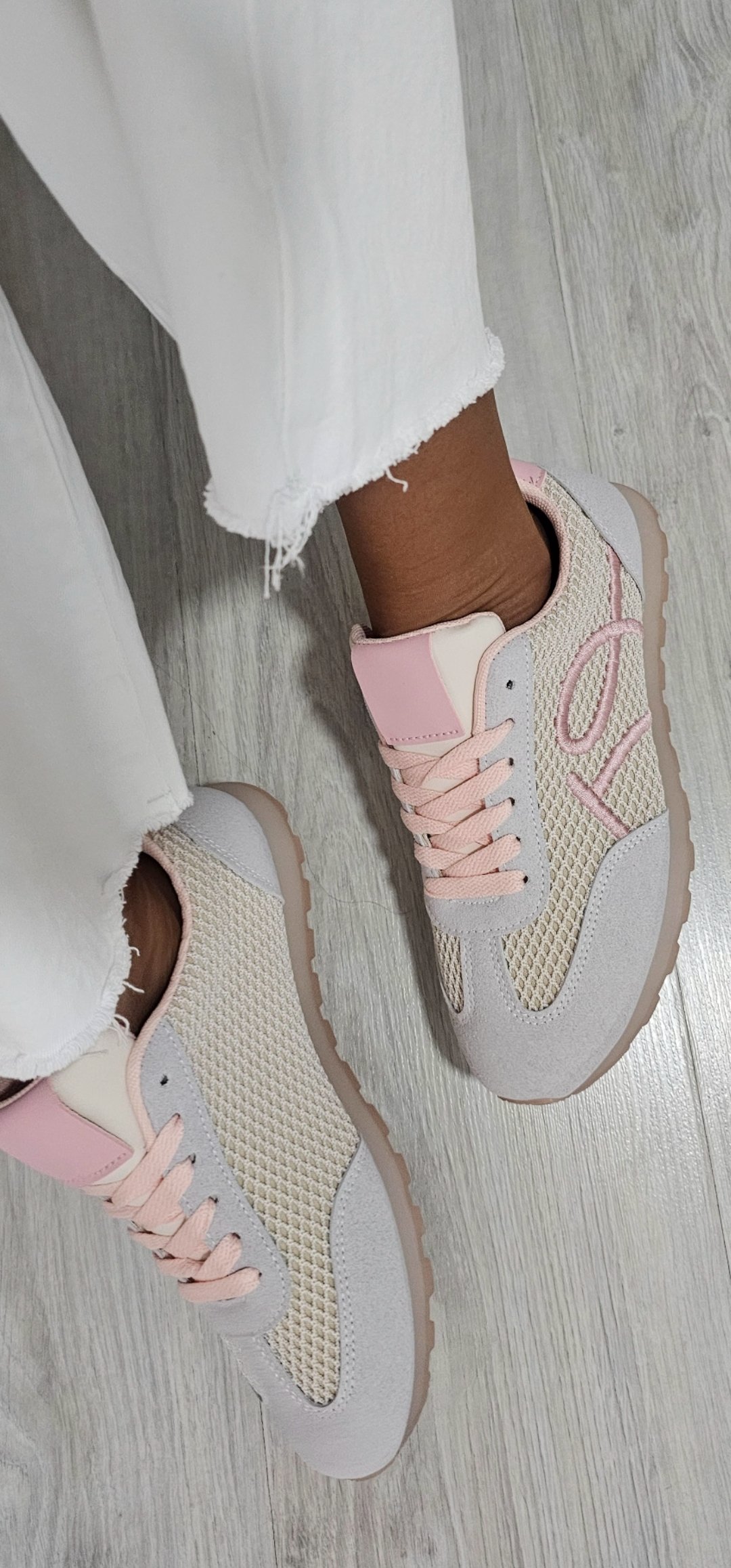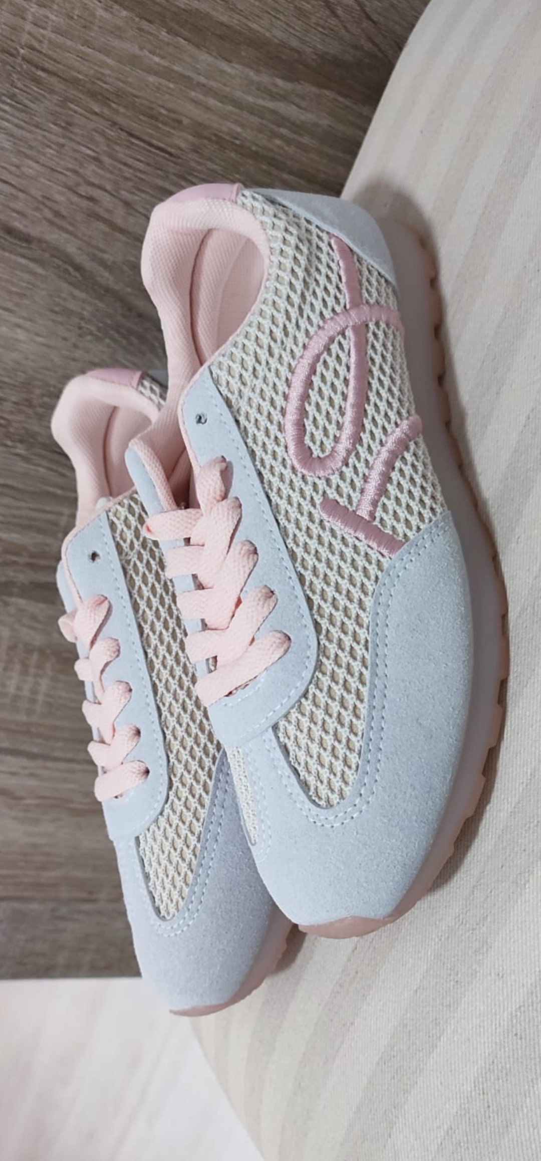 Monisima y cómodas zapatillas en tejido de lana y antelina con un corte súper bonito y tonos rosa blanco y gris